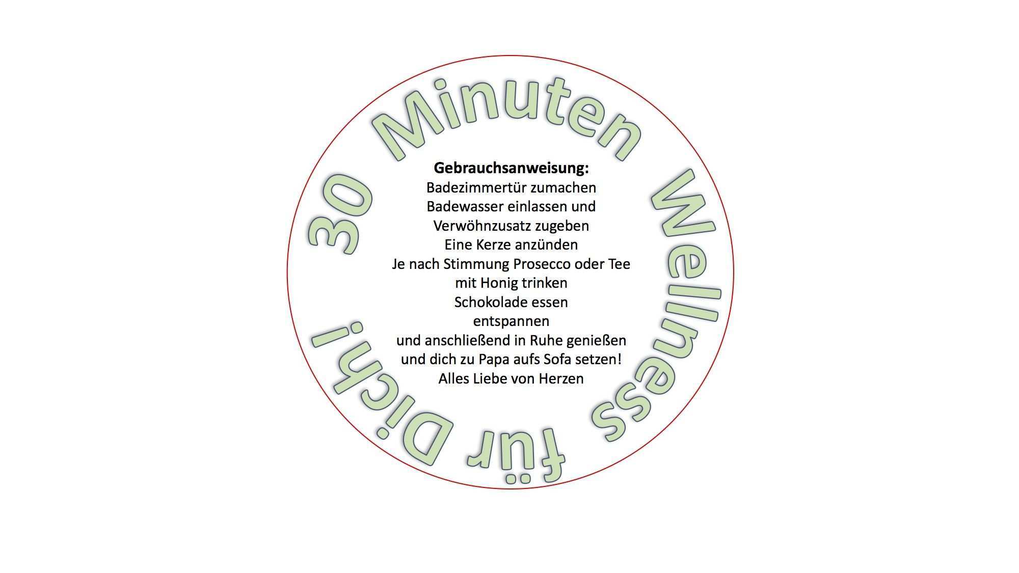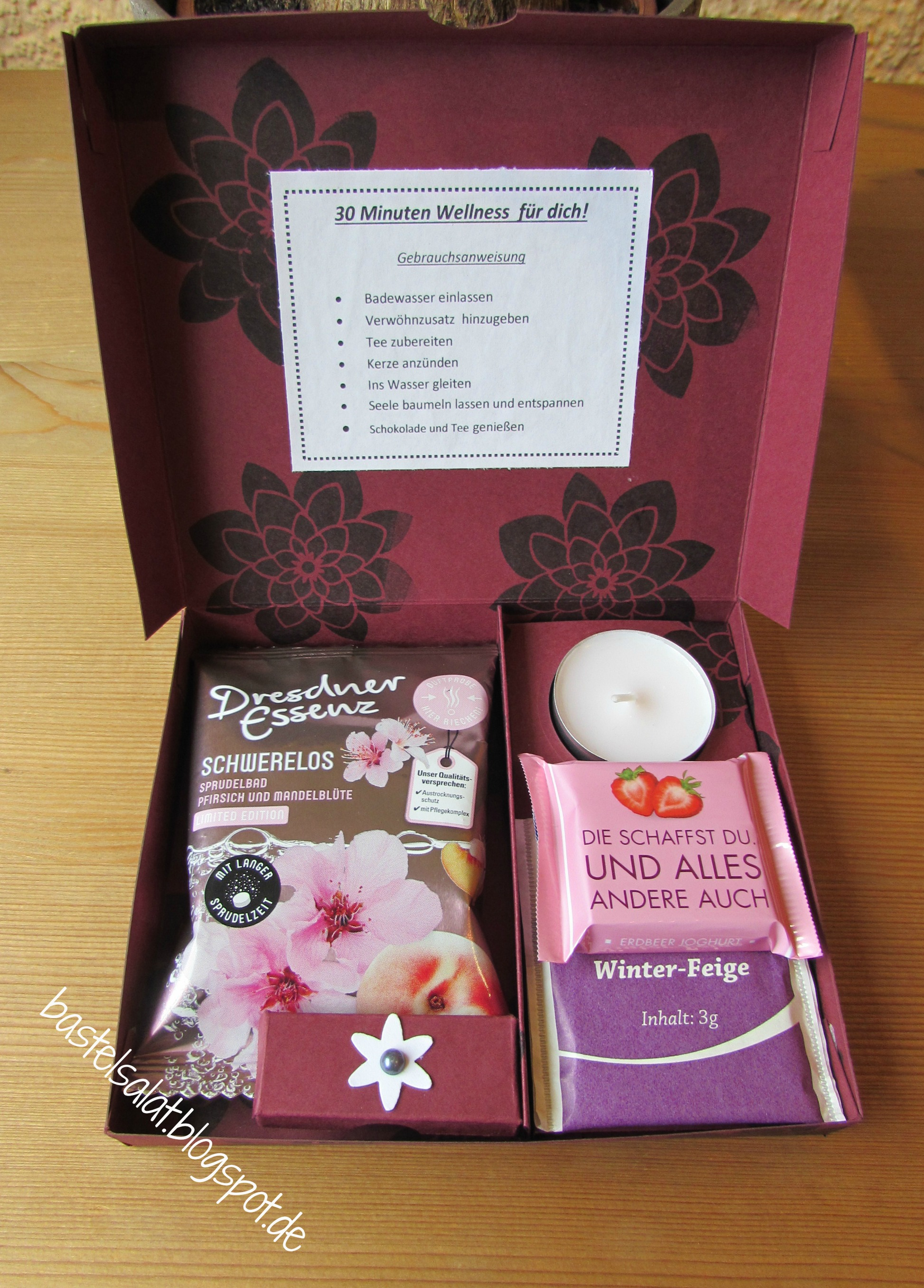 Wenn du meinen post auf facebook gesehen hast hast du dich vielleicht auch über die süßen wellnesstüten gefreut. Als kleine aufmerksamkeit oder kleines mitbringsel ist die 30 minuten wellness box super schön. 30 minuten wellness aus der tüte inkl anleitung geschenk idee wellness tüte kneipp entspannungsbad wellness im glas mit vorlage zum selbst drucken ein schnelles geschenk für mut aletheias welt diy 30 minuten wellness aus der tüte beschriftet ein kleines farbiges stück papier von hand oder mit dem pc mit der anleitung wie man 30 minuten. 30 minuten wellness in der box split top box inkl als kleine aufmerksamkeit oder kleines mitbringsel ist 30 minuten wellness box super schön ich habe für box eine sogenannte split top box gewerkelt anleitung druckvorlage weiter unten bei der box ist als highlight auch noch ein schüttelfenster mit glitzerpailletten eingebaut so macht kleine aufmerksamkeit bestimmt große freude beim.