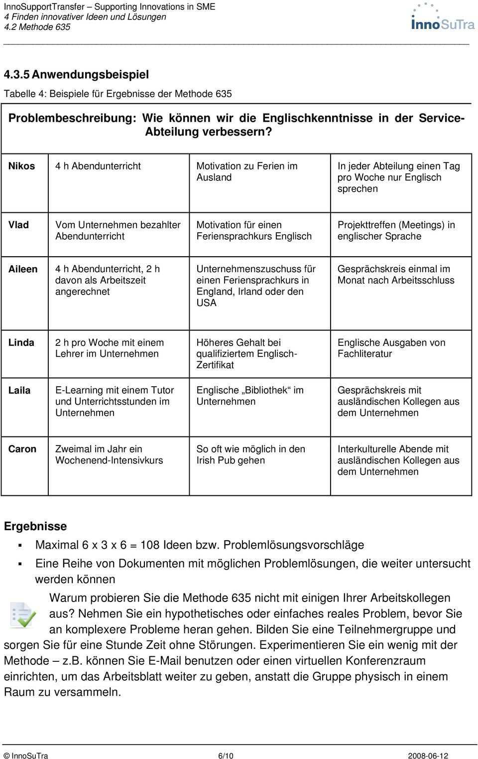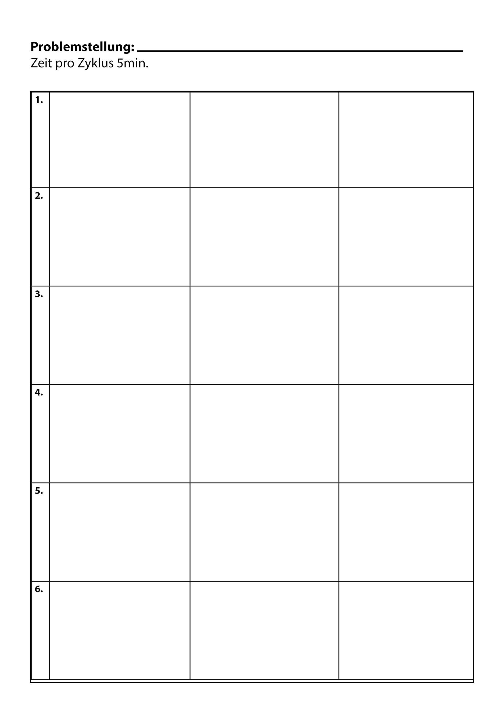 Dieses wird mit drei spalten und sechs zeilen in 18 kästchen aufgeteilt. U auf dem zunächst die genaue aufgabenstellung festgehalten wird. Durch rotation der übung werden die ideen.
