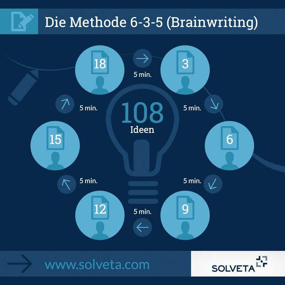 Der name 635 steht für 6 teilnehmer 3 ideen 5 weitergaben und beschreibt bereits den ablauf der methode. Daraus ergeben sich 108 vorschläge 3 x 6 x 6 die schriftlich vorliegen. Im gegensatz zum brainstorming entfällt die problematik der leitung der gruppe. Brainwriting ist sehr effizient.