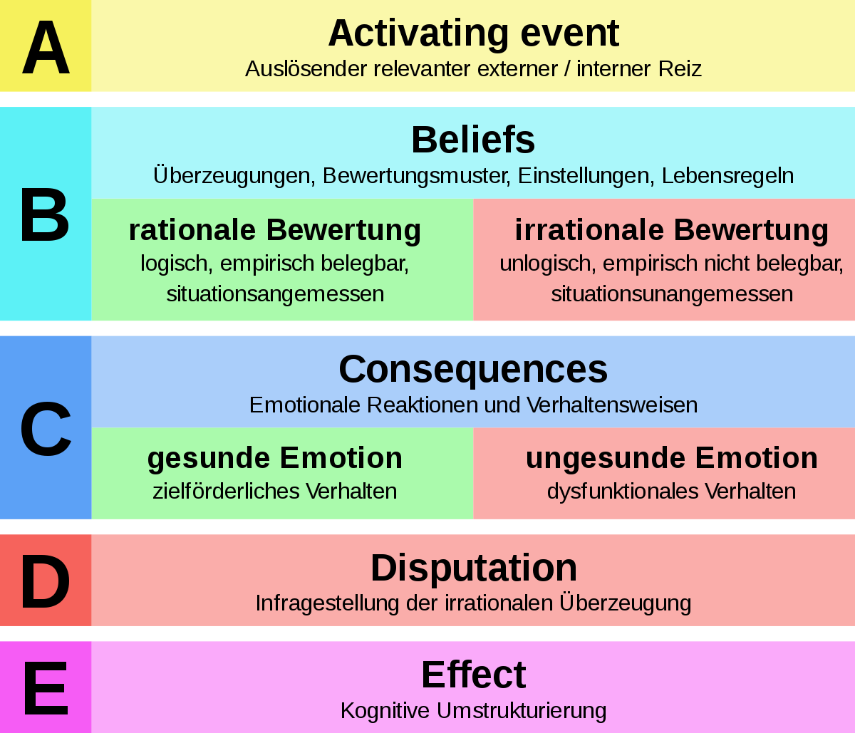 Das abc modell unterscheidet zwischen a der aktivierenden situation b meinen gedanken über diese situation und c den konsequenzen wie ich mich im angesicht dieser situation fühle und handle.