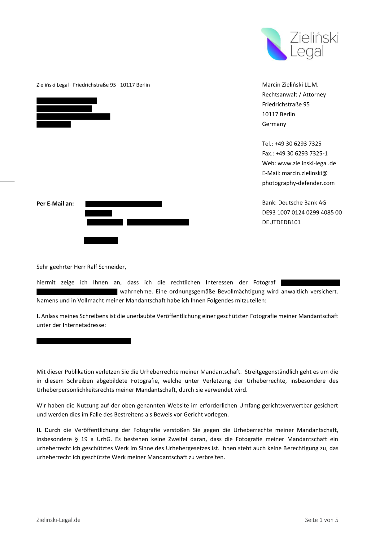 Unser mandant ist inhaber der deutschen marke zum aktenzeichen de für waren und dienstleistungen der klassen 09 35 und 42. Das entsprechende schreiben wird stets individuell formatiert.
