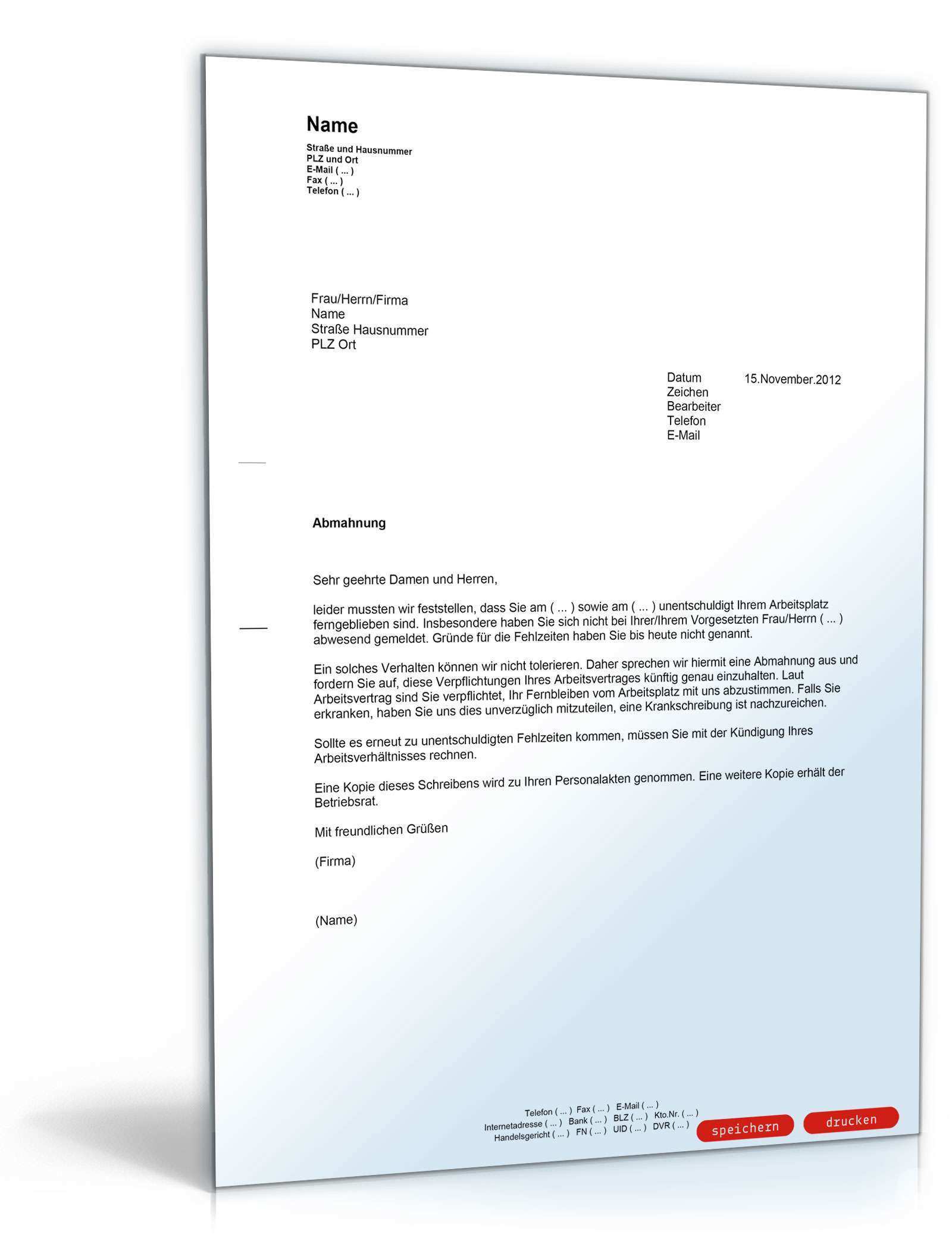 Wichtig ist dass sie diese vorlage vor der verwendung durch ihre individuellen daten anpassen. Die abmahnung aufgrund von unentschuldigtem fehlen ist nicht an formen gebunden sollte jedoch bestimmte angaben enthalten. Sehr geehrte r frau herr zu unserem bedauern mussten wir feststellen dass sie am datum unentschuldigt nicht zur arbeit bei ort erschienen sind ohne hierfür eine begründung anzugeben und ihren arbeitgeber darüber in kenntnis zu setzen.