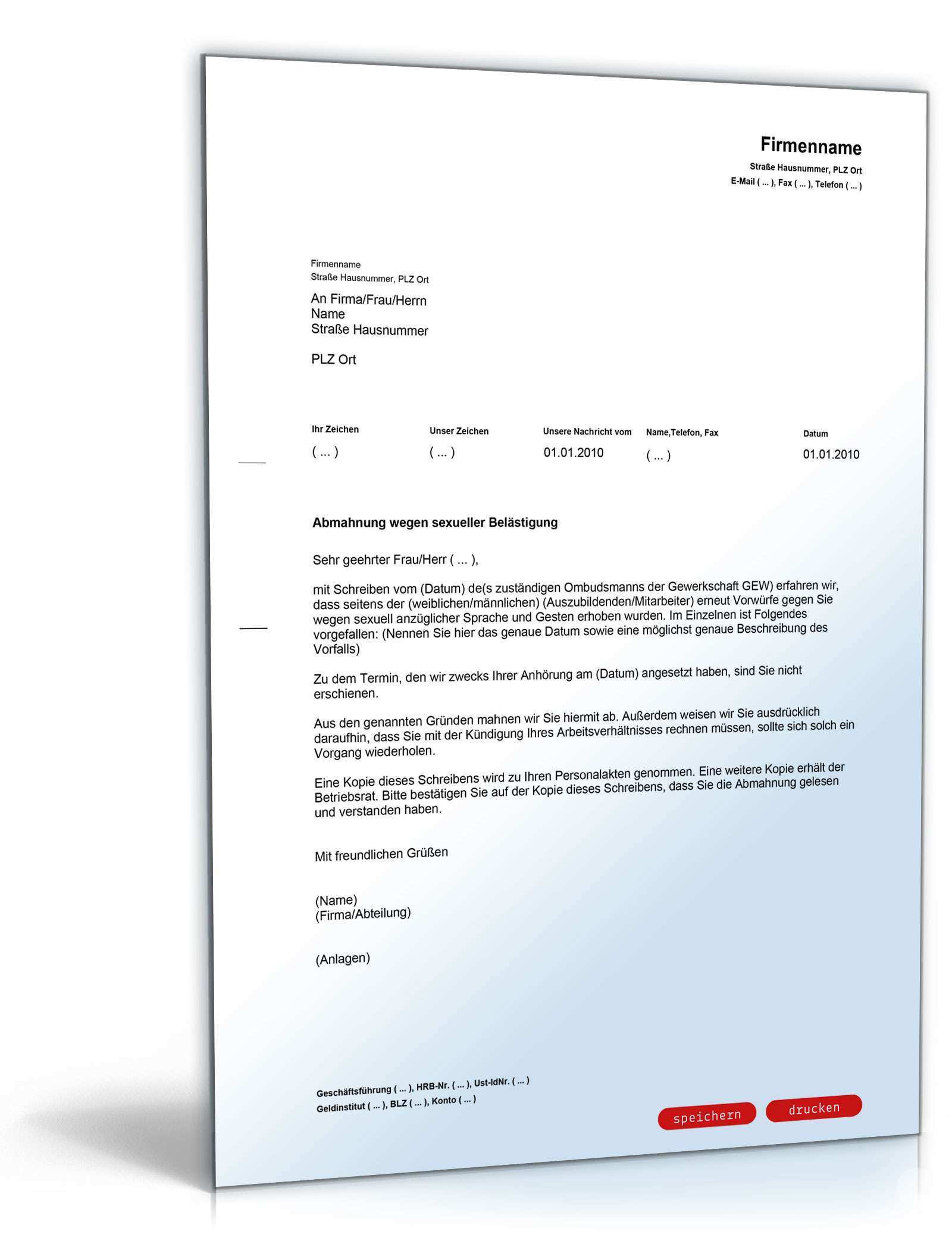 Ja ich willige ein dass die formblitz gmbh mir regelmäßig news zu rechtlichen änderungen und sonderaktionen an meine oben genannte e mail adresse schickt. Es ist grundsätzlich davon abzuraten vorlagen aus dem internet blind zu vertrauen und diese ohne fachkundige anpassungen zu übernehmen. Abmahnung wegen sexueller belästigung muster posted on july 10 2020 by admin sie oder das obere management verfügten über angemessene strategien und verfahren um sexuelle belästigung am arbeitsplatz zu verhindern. Home kündigung abmahnung abmahnungsschreiben sexuelle belästigung abmahnungsschreiben sexuelle belästigung hier finden sie das passende formular um eine abmahnung für einen mitarbeiter angestellten oder arbeitnehmer zu erstellen welcher aufgrund einer sexuellen nötigung belästigung stalking oder mobbing am arbeitsplatz aufgefallen ist.