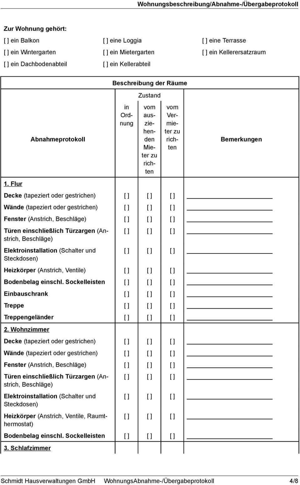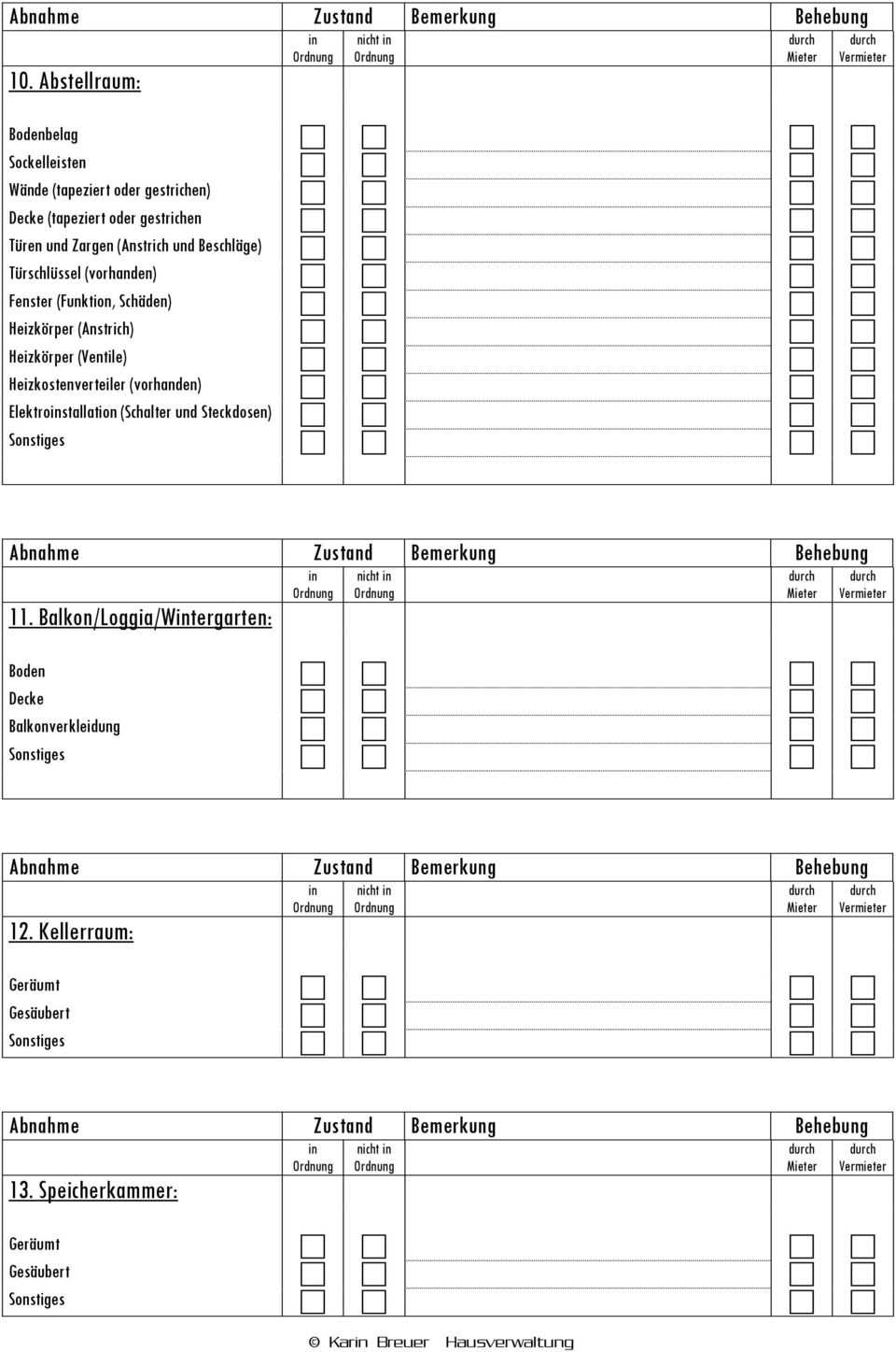 Ein wohnungsübergabeprotokoll oder abnahmeprotokoll vermeidet jedoch ärger und streitigkeiten wenn es um anfallende kosten hinsichtlich reparaturen oder energieversorgung geht. Abnahmeprotokoll eigentumswohnung dieses dokument finden sie auf www optimal absichern de. Es ist als emp fehlung zu verstehen ersetzt bei zweifelsfragen aber keine rechtliche beratung durch anwälte notare oder eine andere stelle.