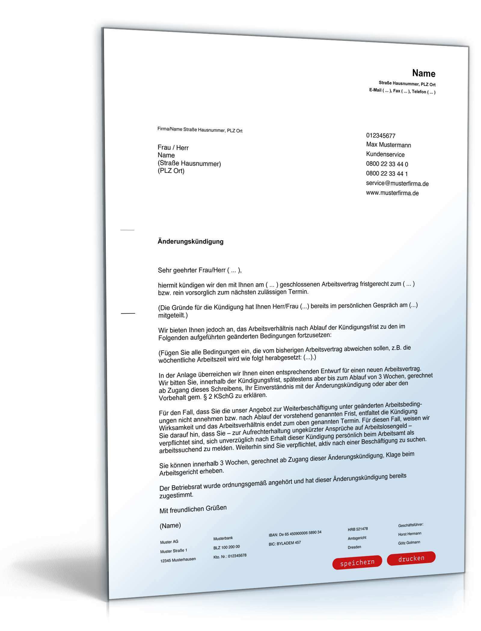 Aenderungskuendigung durch arbeitnehmer muster. Transparent und auf kmu bedürfnisse abgestimmt. Der grundsatz dass kündigungen schriftlich erfolgen müssen um wirksam zu sein gilt nicht nur für die normale beendigungskündigung sondern auch für die änderungskündigung. änderungsanbebot ohne kündigung pdf 14 kb änderungskündigung. Hier finden sie musterschreiben für arbeitgeber als pdf zum download.