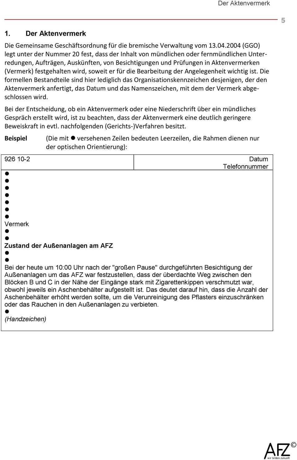 Zu einer modernen verwaltung gehört eine moderne sprache. Was schwer verständlich ist wird ungern und mit großem aufwand gelesen oder gar nicht. Frau schmidt vermerk veröffentlichung der gemeinsamen geschäftsordnung der ministerien ggo text schmidt 13 12 2005 1 v 2 kopfbogen mi 1. Der aktenvermerk der vermerk für eine akte ist vor allem in der öffentlichen verwaltung aber auch in sonstigen administrationen in denen akten geführt werden gebräuchlich.