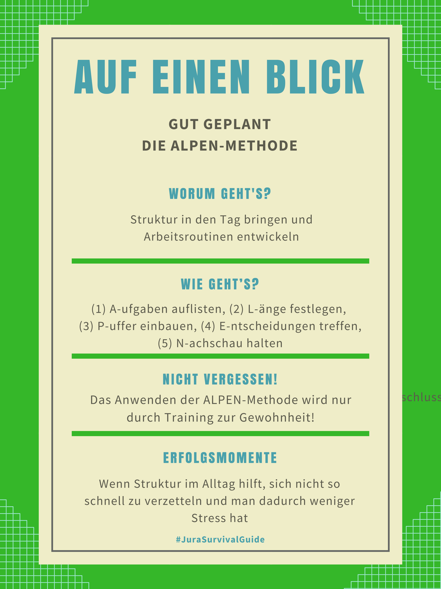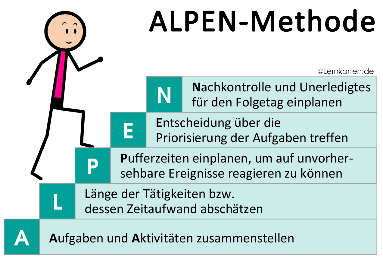Wichtig ist dabei auch bei der pla nung real is tisch zu bleiben und sich keine unüber wind baren hür den zu schaffen. Die universelle lösung für alle zeitprobleme kann sie aber nicht sein. Bei der nachkontrolle können sie gleich den nächsten tag strukturieren. Die fünf buchstaben alpen stehen für die die fünf arbeitsschritte mit denen der tagesablauf geplant werden kann.