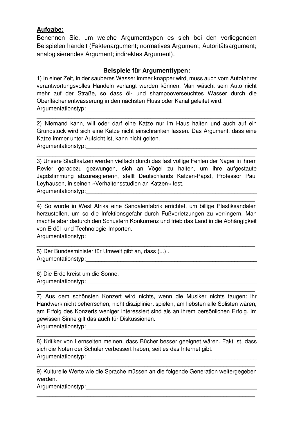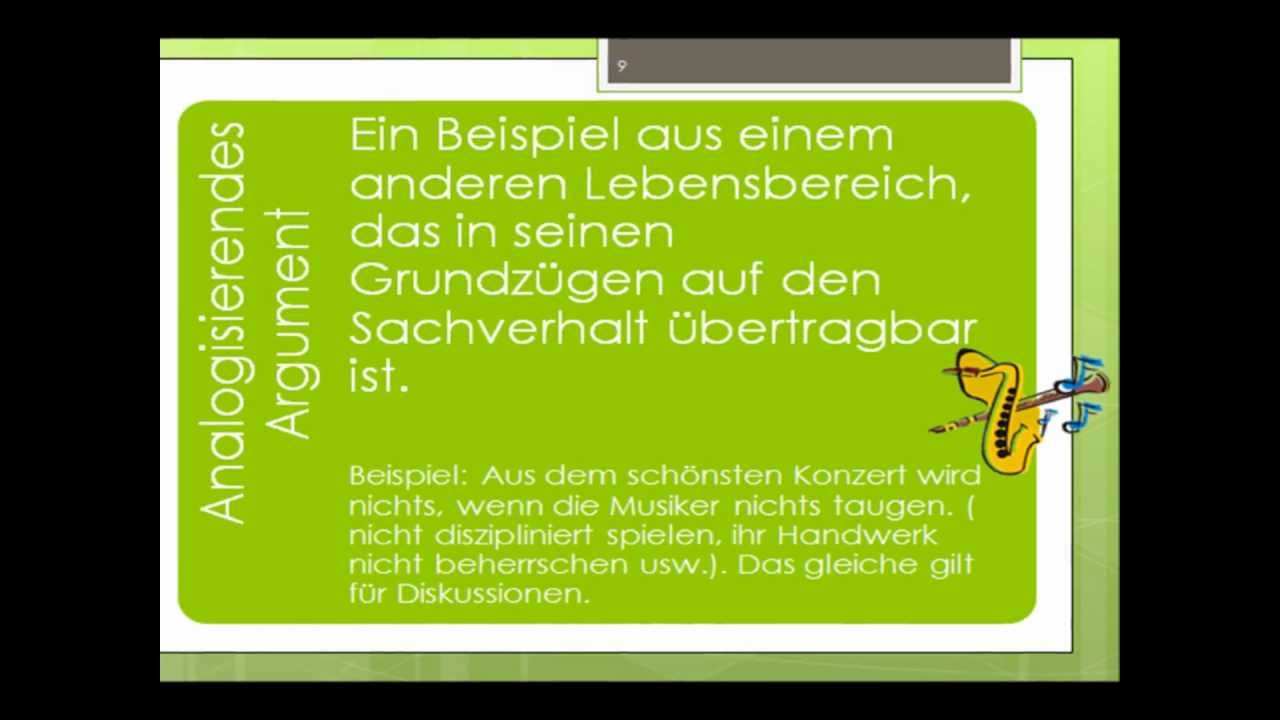 Beispiel für eine argumentation aufbau siehe oben. Beispiel logisches nutzwertargument diese argument besteht aus zwei oder mehreren prämissen voraussetzung annahme und einer schlussfolgerung konklusion die logisch aus den prämissen folgt. Im obigen beispiel wird die aussage dass ein drehbuch nur dann in einem guten film resultiert wenn nicht jeder an sich denkt auf die gesprächsführung in einer diskussion bezogen. Analogisierendes argument aus dem besten drehbuch wird nichts wenn jeder darsteller die hauptrolle einnehmen möchte und nur an sich selbst denkt.
