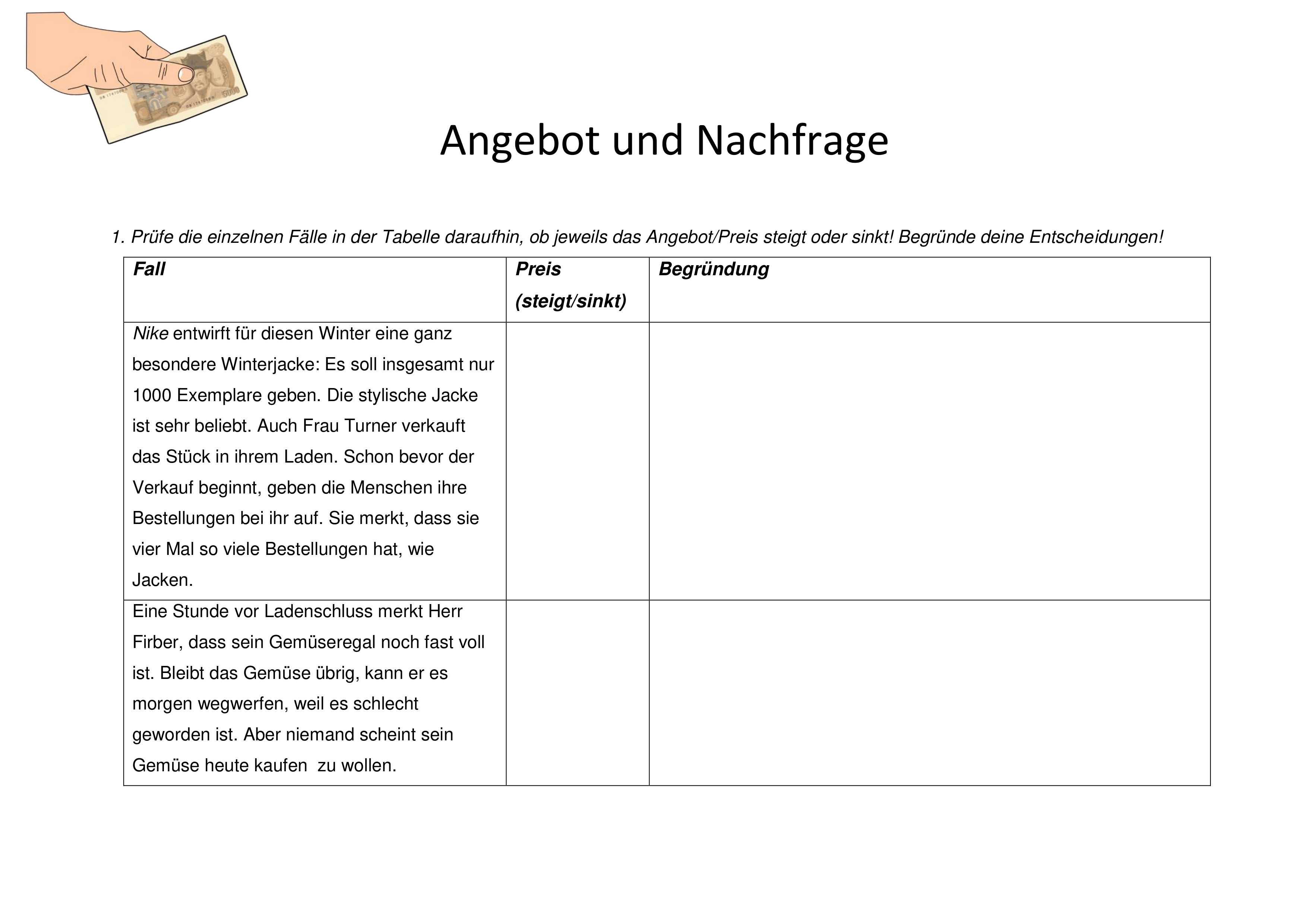 Angebot und nachfrage beispiel. Nachfrage nach und angebot von schokoladetafeln preis je tafel nachfrage angebot 0 200 0 1 160 0 2 120 40 3 80 80 4 40 120 5 0 160 6 0 200 7 0 240 tab. All diese märkte haben eins gemeinsam. Ist die ernte von äpfeln sehr hoch kann mehr apfelsaft produziert werden bleibt die nachfrage aber unverändert wird mehr produziert als gekauft wird somit sinkt der preis von apfelsaft. Unter angebot und nachfrage versteht man die reine menge der zum kauf angebotenen produkte und die menge der leute die diese produkte erwerben wollen.