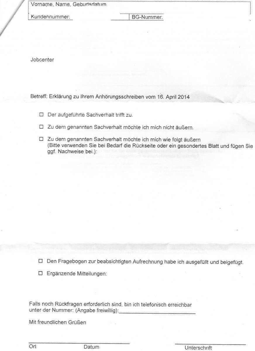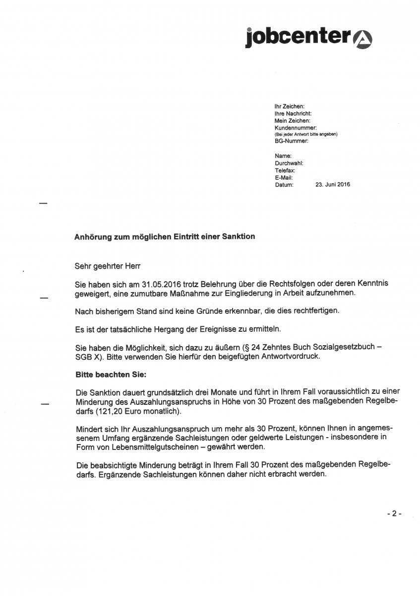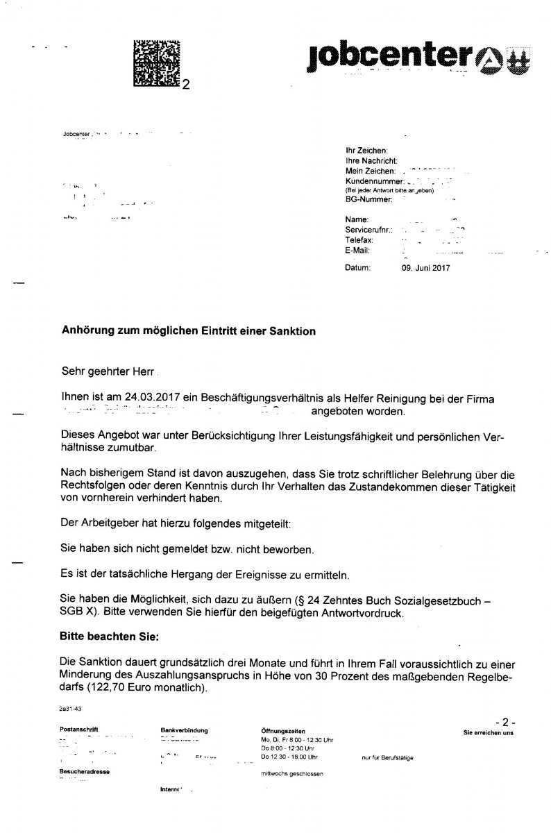 Es geht darum das ein bewerbungstraining angeortnet war ich dieses aber nicht nachgekommen bin da ich im bekanntenkreis erfahrene hilfe hatte meine jobverm. Die kosten der unterkunft werden separat übernommen. Vorher findet eine schriftliche anhörung statt. Der folgende vordruck wird beispielsweise vom jobcenter erfurt verwendet und der anhörung nach 24 sozialgesetzbuch 10 sgb x beigefügt.
