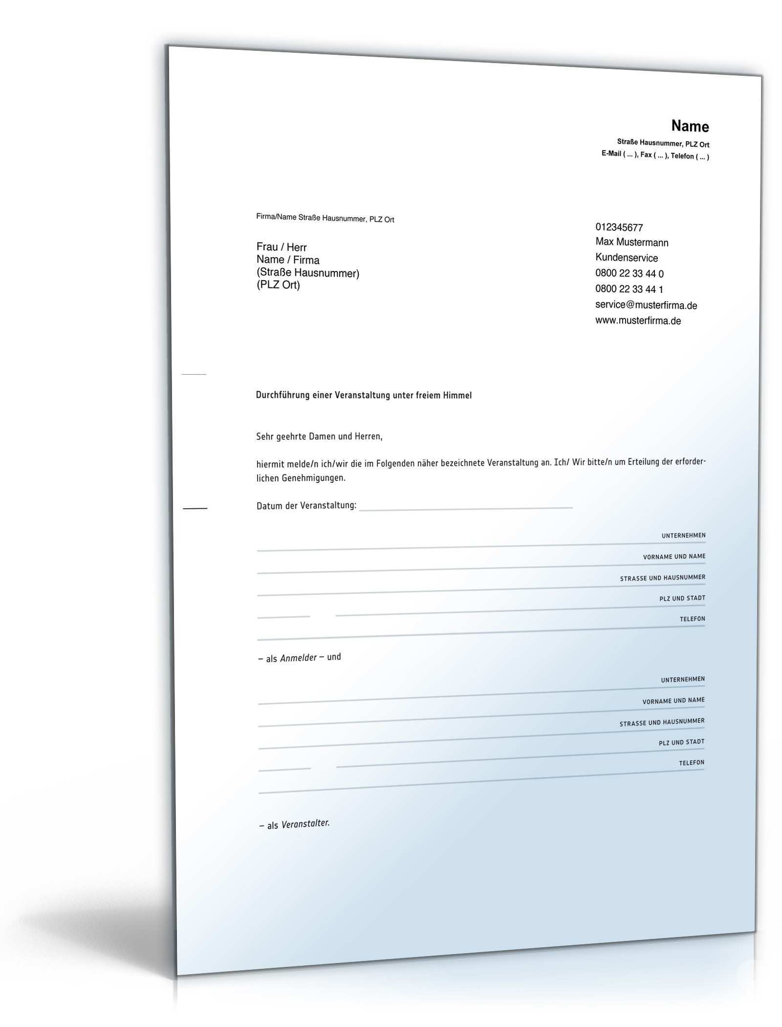 Anmeldung veranstaltung muster. Unabhängig davon ob sie ein musikkonzert eine konferenz ein fundraising oder sogar ihre eigene hochzeit planen. Dann kündigen sie an dass die anmeldung offen ist und interessierte ein ticket buchen können. Telefonnummer für eilige rückfragen rückmeldungen. Muster nutzungsvertrag zwischen vor und zuname nachfolgend vermieter genannt und.