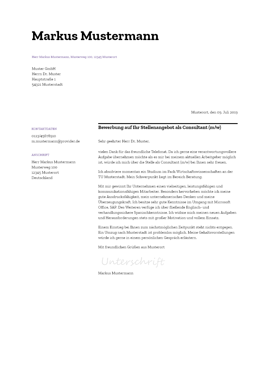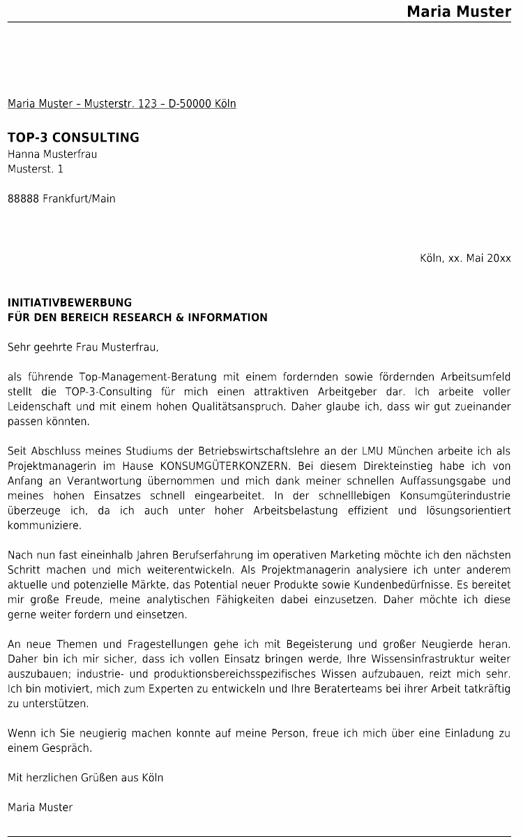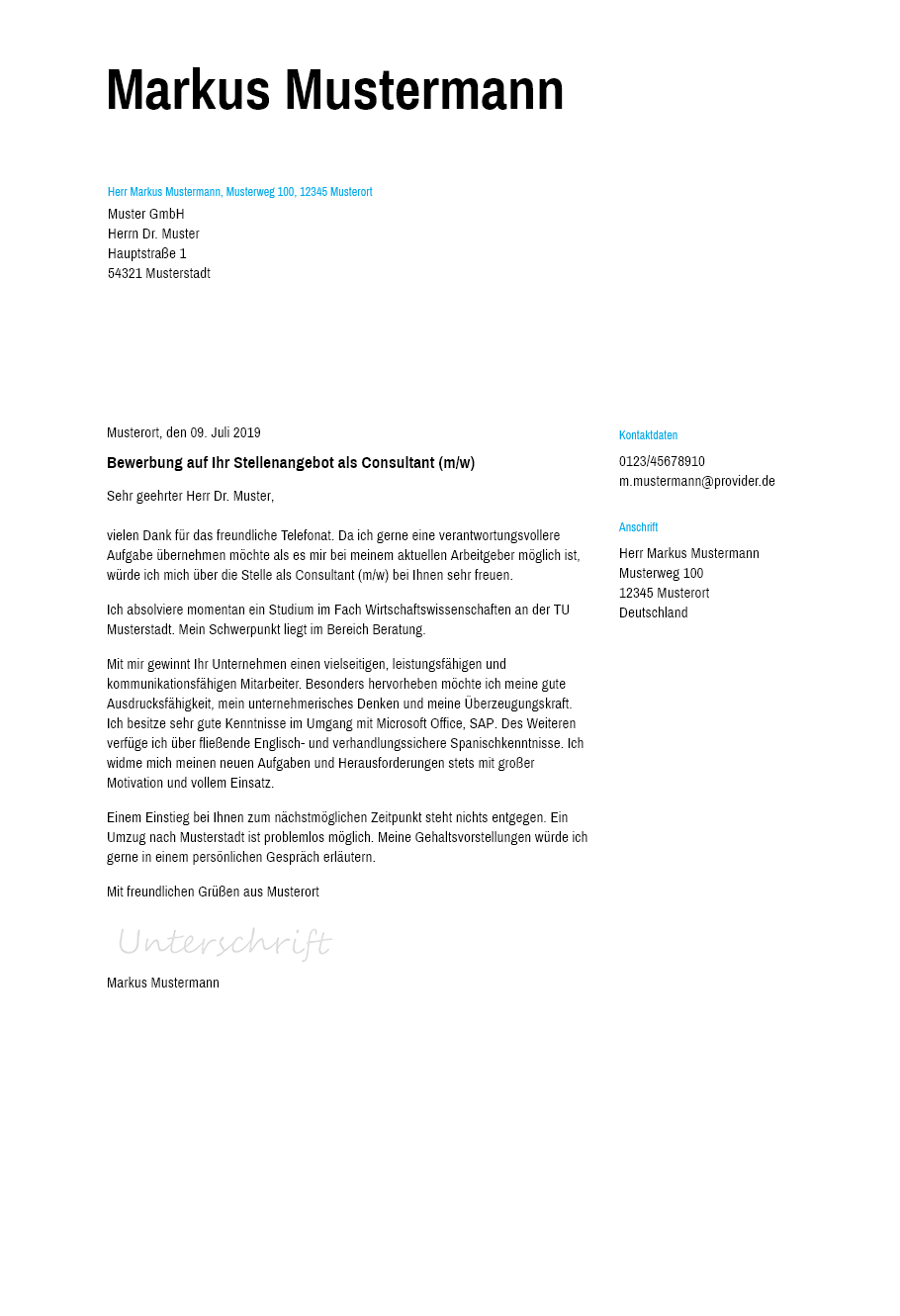 Anschreiben unternehmensberatung muster. Uns ist es wichtig zu verstehen wie sie denken und wie sie zu ihrer lösung kommen meint franziska heitzer. Die richtige lösung steht dabei an zweiter stelle. Unterteilen sie den haupttext ihres anschreibens in mehrere absätze die inhaltlich zusammenhängen und einen roten faden erkennen lassen. Alle jobs von roche.