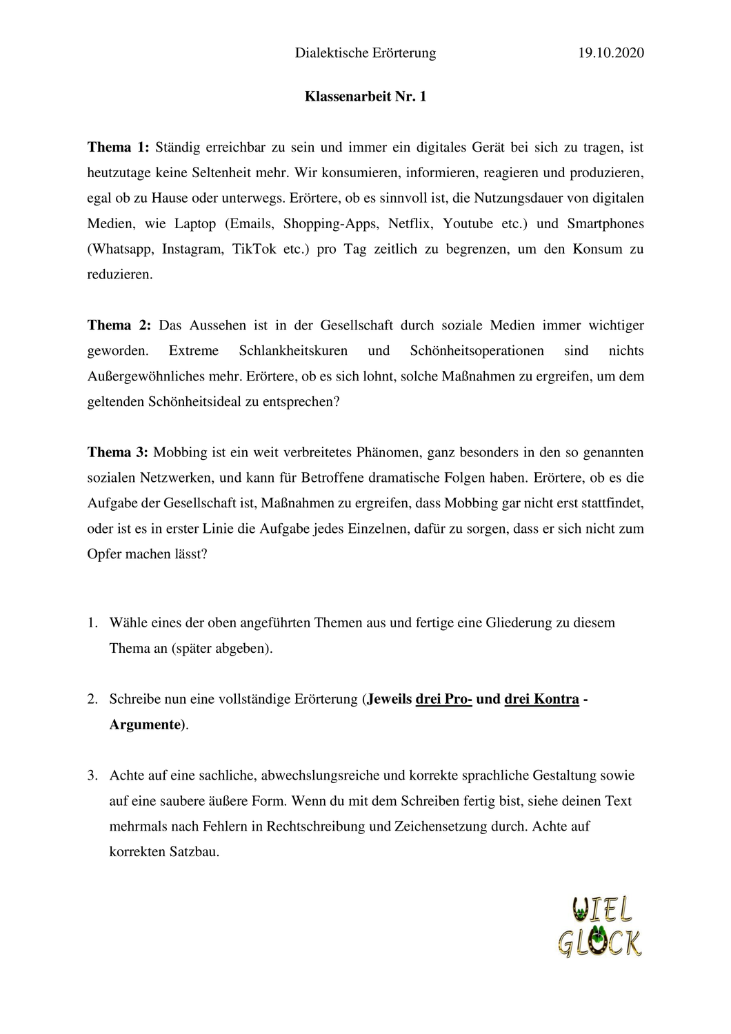 In der parallelklasse war bereits ein solcher fall. Die antithetische oder dialektische erörterung. Sagen sie zum beispiel. Hier sind einige beispiel erörterungen auf unserer seite.