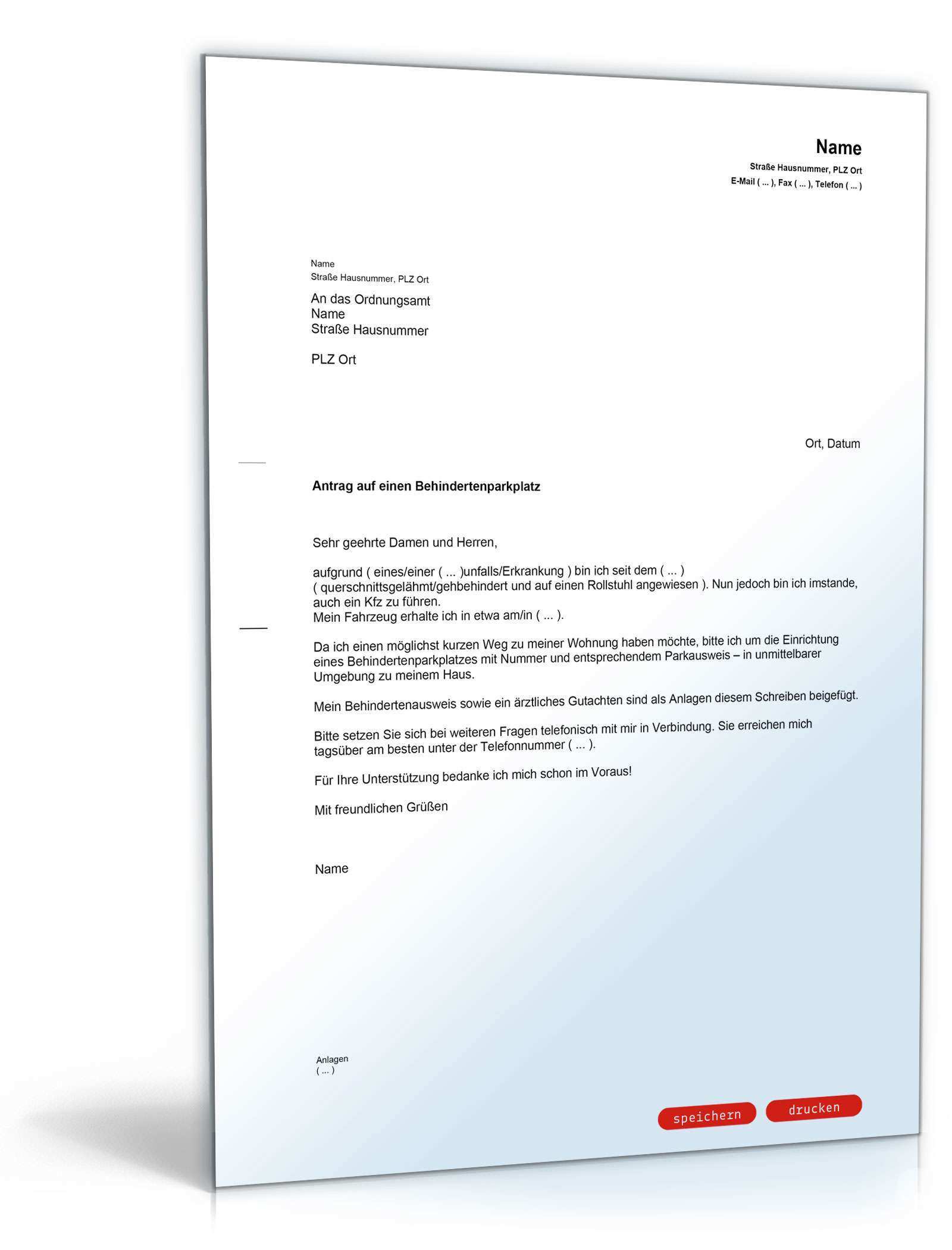 Mit diesem musterbrief stellen sie einen antrag auf einrichtung eines behindertenparkplatzes mit nummer und entsprechendem parkausweis in unmittelbarer nähe zu ihrer wohnung oder zu ihrem haus. Die strafe beläuft sich auf 35 euro stand märz 2018. Vorlage sofort zum download als pdf oder word. 11 stvo wird für den folgenden personen gruppen auf antrag eine parkerleichterung für das parken auf einem behindertenparkplatz ausgestellt.
