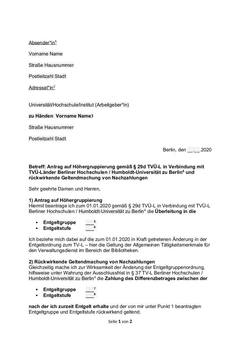 2533 08 2808 65 3020 62 differenz. 2607 28 e 10. März 2009 stelle ich hiermit den antrag meine vergütungsgruppenzulage die ich bei fortgeltung des bat bat o am erhalten hätte zu zahlen. 1 antrag auf höhergruppierung hiermit beantrage ich zum 01 01 2020 gemäß 29d tvü l in verbindung mit tvü l berliner hochschulen humboldt universität zu berlin4 die überleitung in die entgeltgruppe 5 entgeltstufe 6 ich beziehe mich dabei auf die zum 01 01 2020 in kraft getretenen änderung in der.