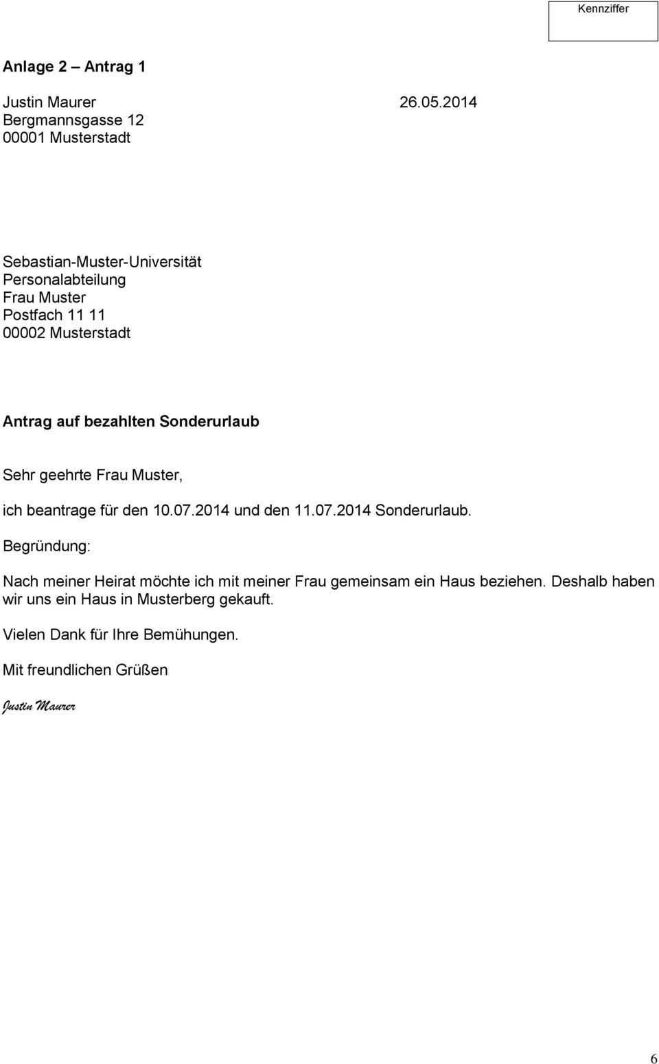 Andere bezeichnungen des dokuments. Muster für einen antrag auf sonderurlaub. Dieses muster soll ihnen als formulierungshilfe dienen. Diese sollten sie entsprechend ihrer bedürfnisse verändern bevor sie den antrag bei ihrem arbeitgeber stellen.