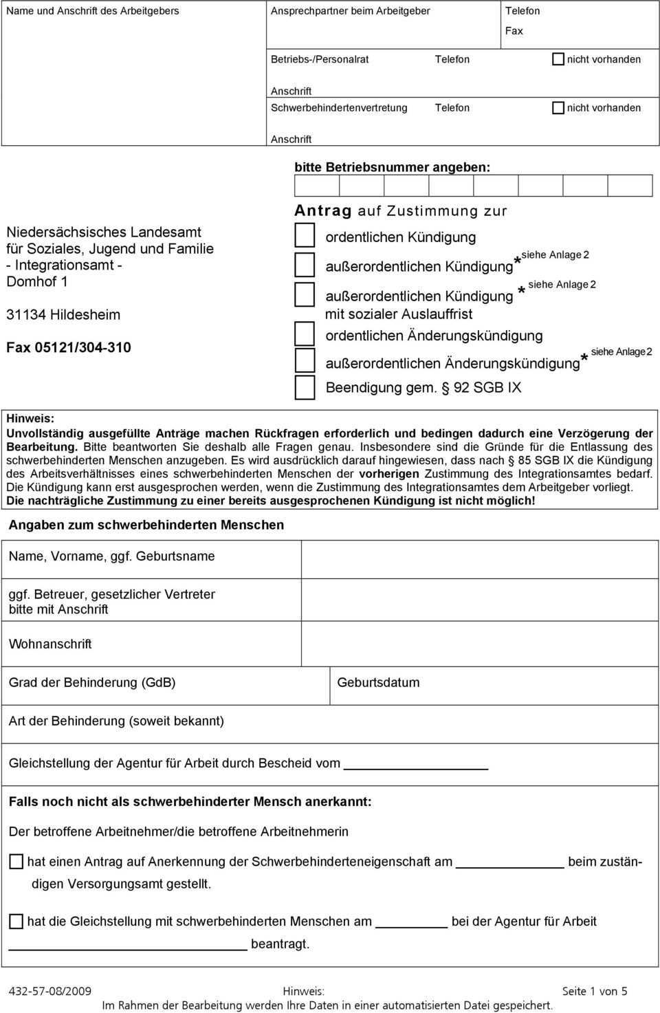 Dies gilt auch für den fall der beabsichtigten änderungskündigung. Antrag und anlagen bitte dreifach einreichen. Antrag auf gewährung von leistungen zur schaffung von arbeits und ausbildungsplätzen gemäß 15 schwbav. Einholung der zustimmung des integrationsamtes an das integrationsamt betr.
