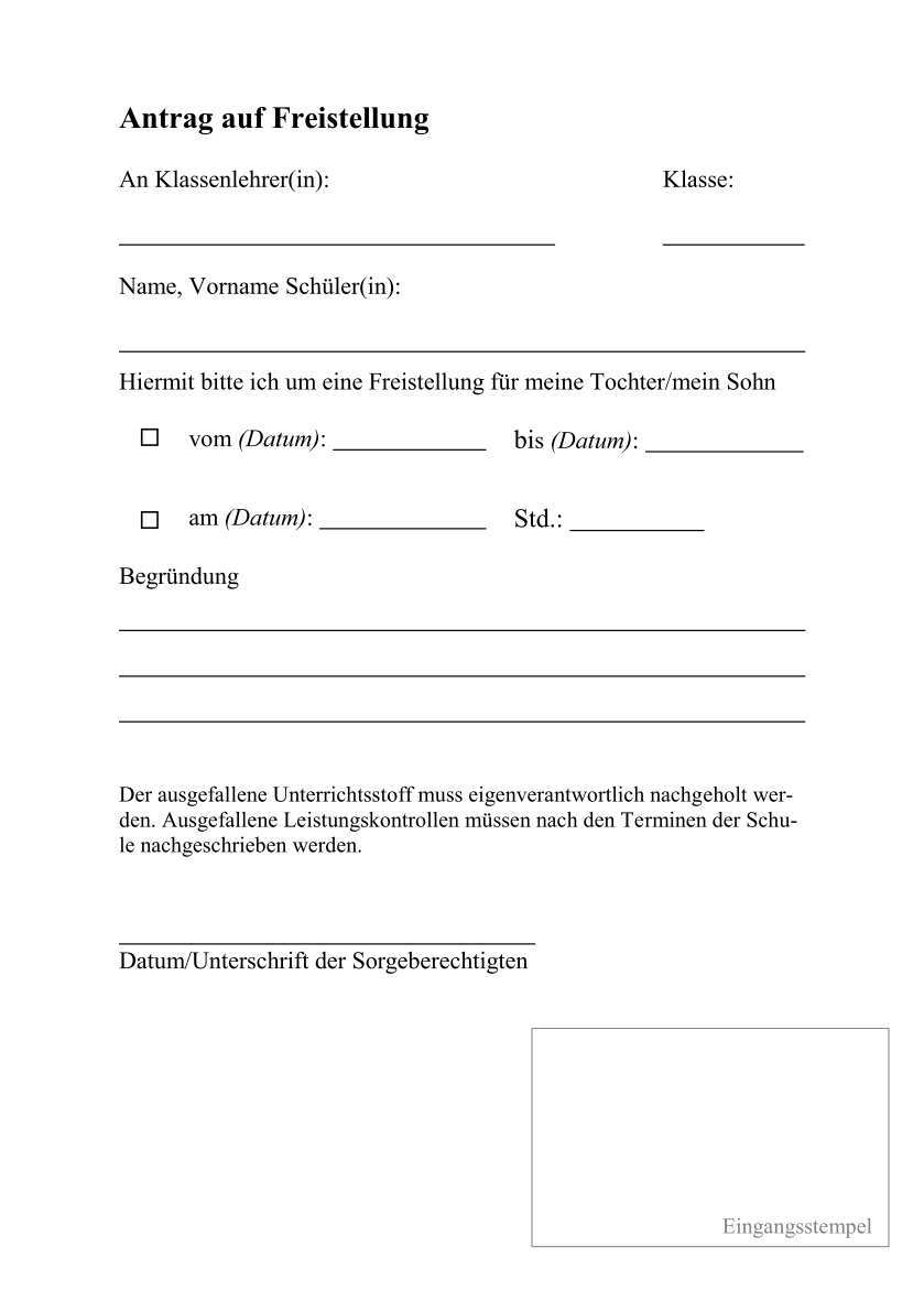 Antrag freistellung schule muster kur. Sind sie selbst noch schüler und 18 jahre alt reicht es aus wenn sie diesen antrag für sich selbst stellen und allein unterzeichnen. Die freistellungsbescheinigung im steuerrecht dient dazu den empfänger einer bauleistung von der pflicht des abzugs der bauabzugssteuer zu befreien. Name der schule z. Antrag durch schulleiter abgelehnt weiteres prozedere.