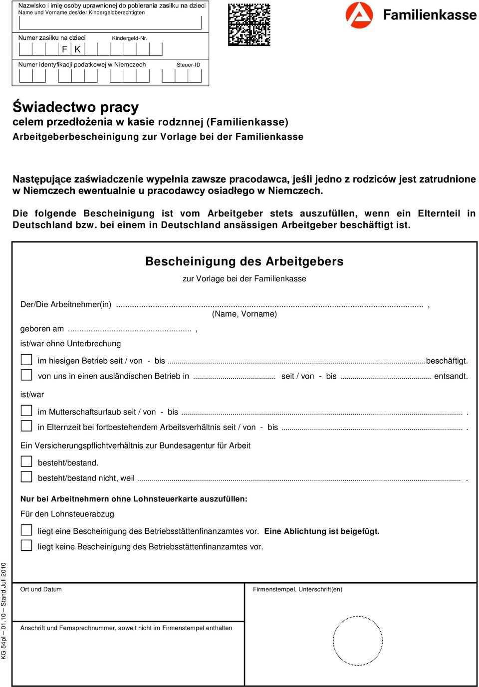 Arbeitgeberbescheinigung zur vorlage bei der familienkasse polnisch. Bescheinigung des arbeitgebers der die arbeitnehmer in. Bescheinigung des arbeitgebers. Zurück zur übersicht aller deutschen kindergeld formulare. Zur vorlage bei der familienkasse.