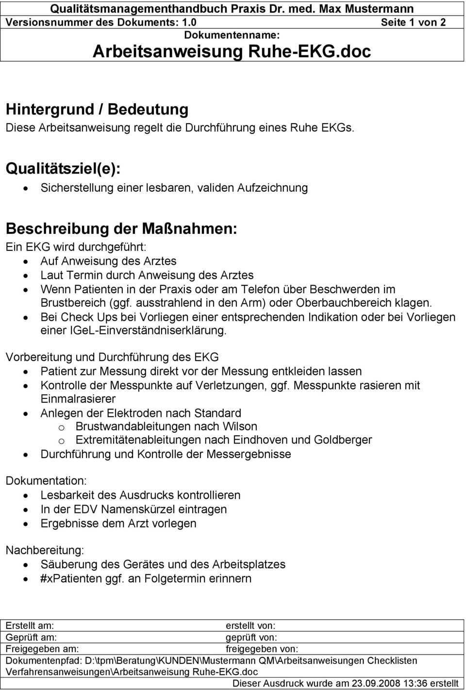 Diese 3 dokumente stelle ich ihnen für kurze zeit in einem bundle zu einem wirklich attraktiven sonderpreis zur verfügung. Schnelle und professionelle arbeitsanweisungen mit unserer kostenlosen vorlage zum thema arbeitsanweisung. Qualität und entwicklung in praxen praxis. Ein ekg wird durchgeführt.