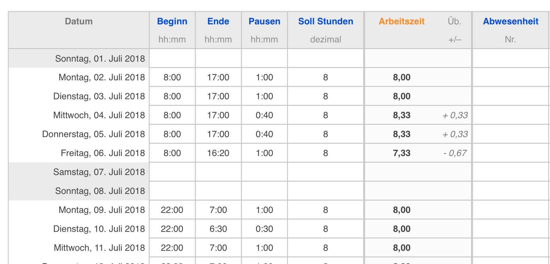 Insgesamt auf das arbeitszeitkonto einstellbar sind somit 22 5 stunden 50 prozent der vereinbarten monatsarbeitszeit 2 stunden 22 minuten gegenwert 24 stunden und 52 minuten. Entspricht das 540 stunden 5 400. Allerdings enthält es einen passus der u. Stundenzettel zum ausdrucken gibt es auf monatlicher und wöchentlicher basis.