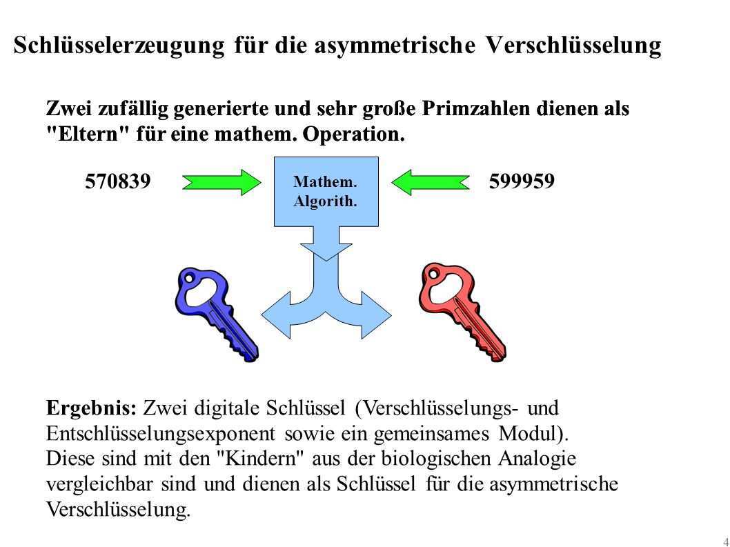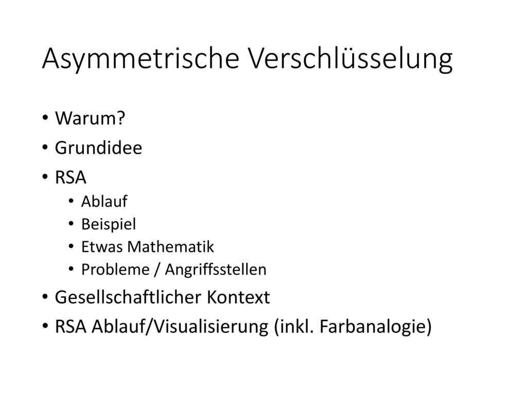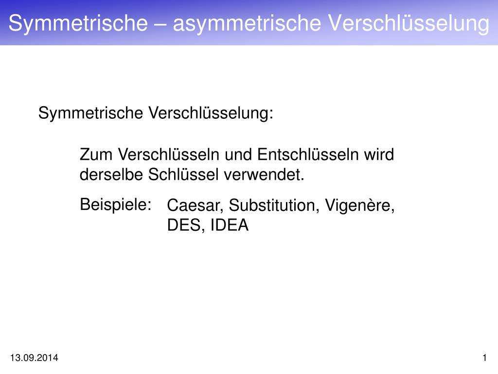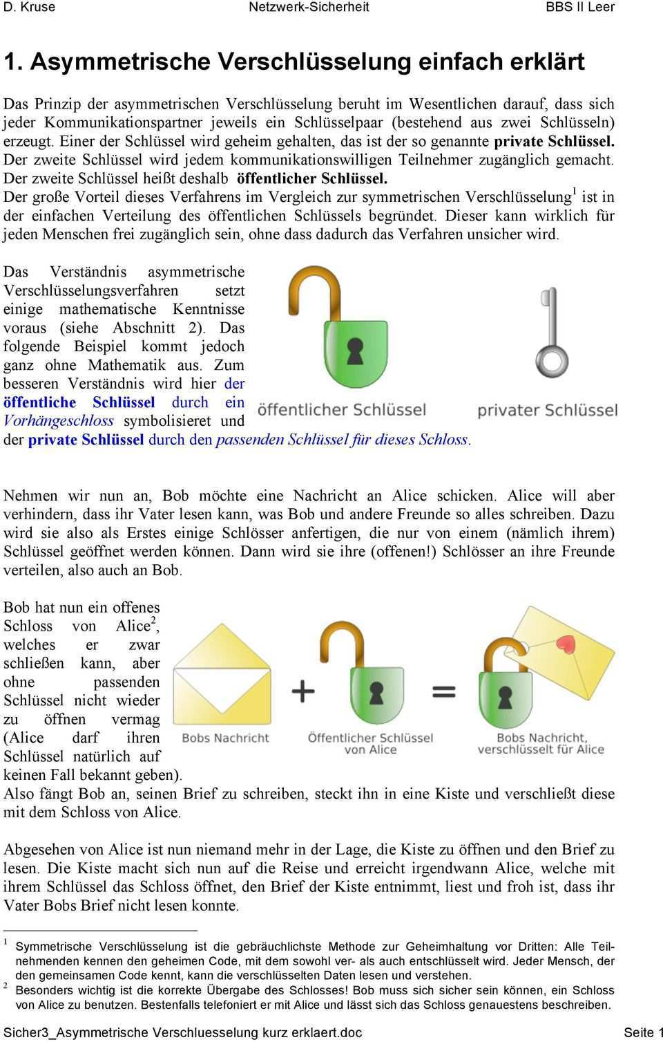 Verschlüsselung 1 ist die von einem schlüssel abhängige umwandlung von klartext genannten daten in einen geheimtext so dass der klartext aus dem geheimtext nur unter verwendung eines geheimen schlüssels wiedergewonnen werden kann. Nun wollen wir uns an einem ganz konkreten beispiel anschauen wie die symmetrische verschlüsselung ablaufen kann. Ein weiterer verschlüsselungsmechanismus der für die verschlüsselungen im netzwerk besonders wichtig ist bei der asymmetrischen verschlüsselung haben wir ein sogenanntes schlüsselpaar dieses paar besteht aus einem öffentlichen schlüssel auch public key genannt und aus einem privaten schlüssel private key genannt der öffentliche. Bekannte beispiele die auf asymmetrische verfahren aufbauen sind openpgp oder auchs mime.