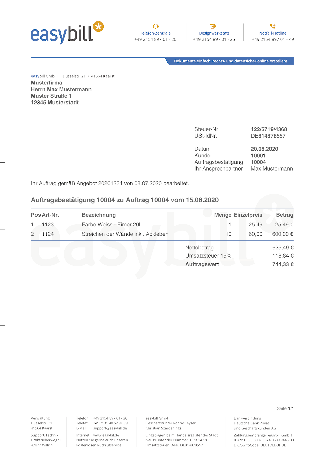 Bau handwerksbetriebe die ihren kunden die korrekte durchführung eines auftrags schriftlich bestätigen wollen. Auftragsbestaetigung vorlage 1 docx auftragsbestaetigung vorlage 1 doc laden sie hier unsere auftragsbestätigung vorlage im word format herunter und erstellen sie schnell und einfach ihre eigenen auftragsbestätigungen. Unsere tipps vordrucke zum schreiben einer auftragsbestätigung machen ihre dokumente zum seriösen hingucker im geschäftsalltag. Mit unserem kostenlosen muster für eine auftragsbestätigung können sie einfach eine rechtssichere auftragsbestätigung schreiben und verhindern so missverständnisse zwischen ihnen und ihren kunden.
