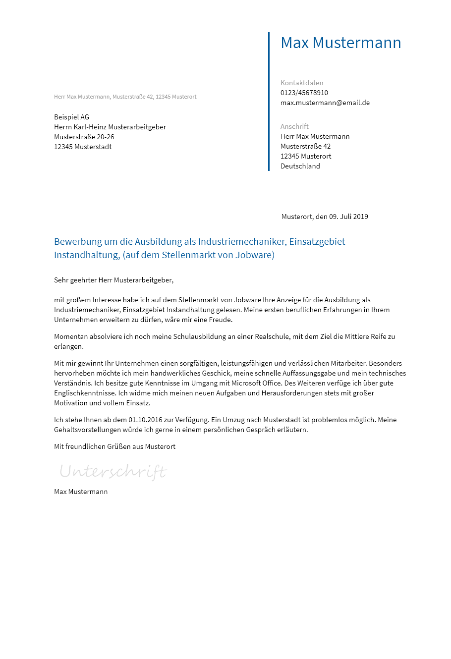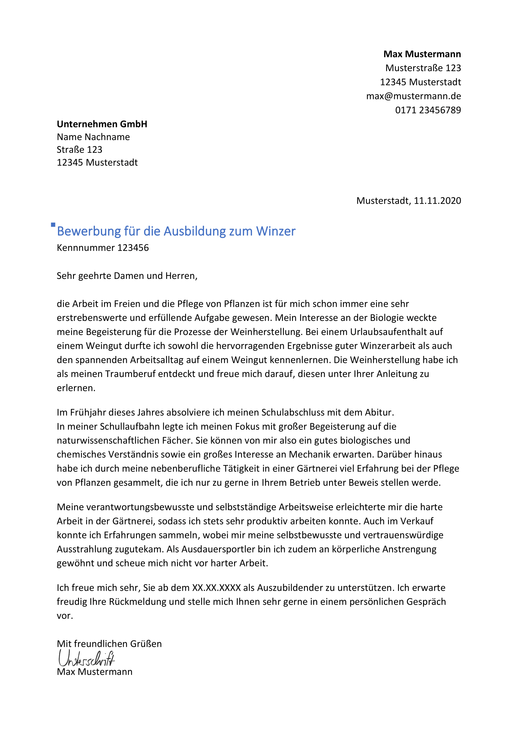 Muster für einen solchen vertrag findest du im internet zum beispiel hier. In einer neuen bewerbung sollten der ausbildungsplatz oder berufswechsel sauber und sachlich formuliert werden. Wie ein bewerbungsschreiben um einen ausbildungsplatz auszusehen hat wissen sie ja denn sie haben sich ja bereits erfolgreich beworben. Ich arbeite selbständig im herrenbereich barbier und werde stark.