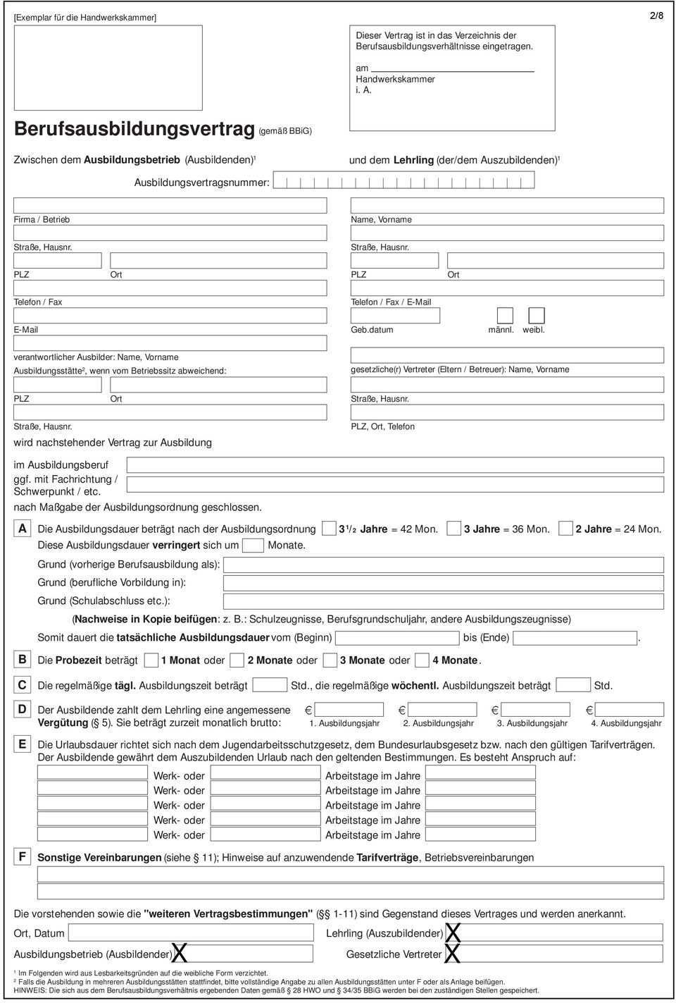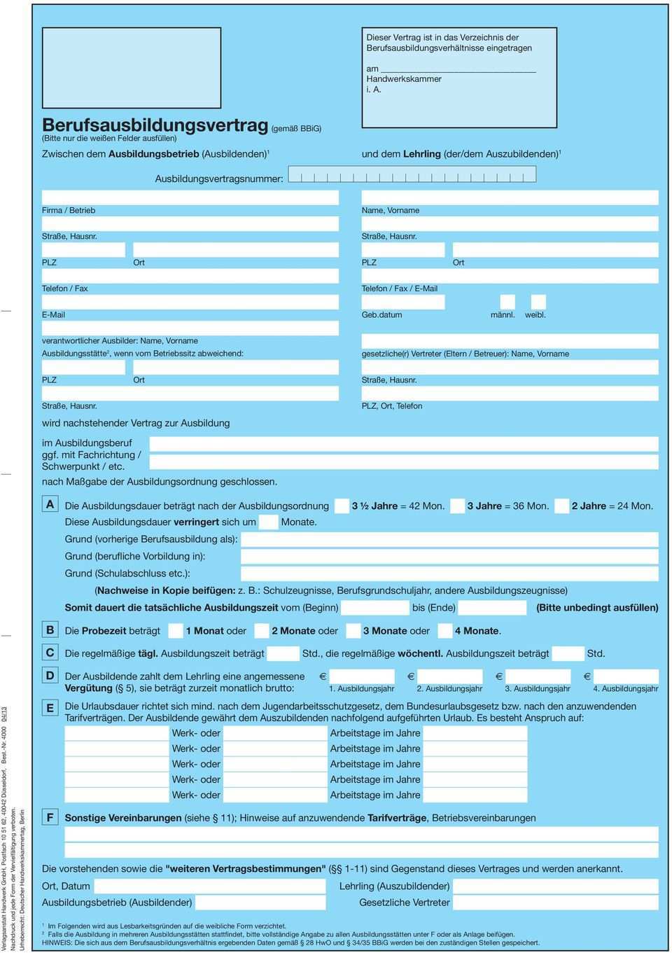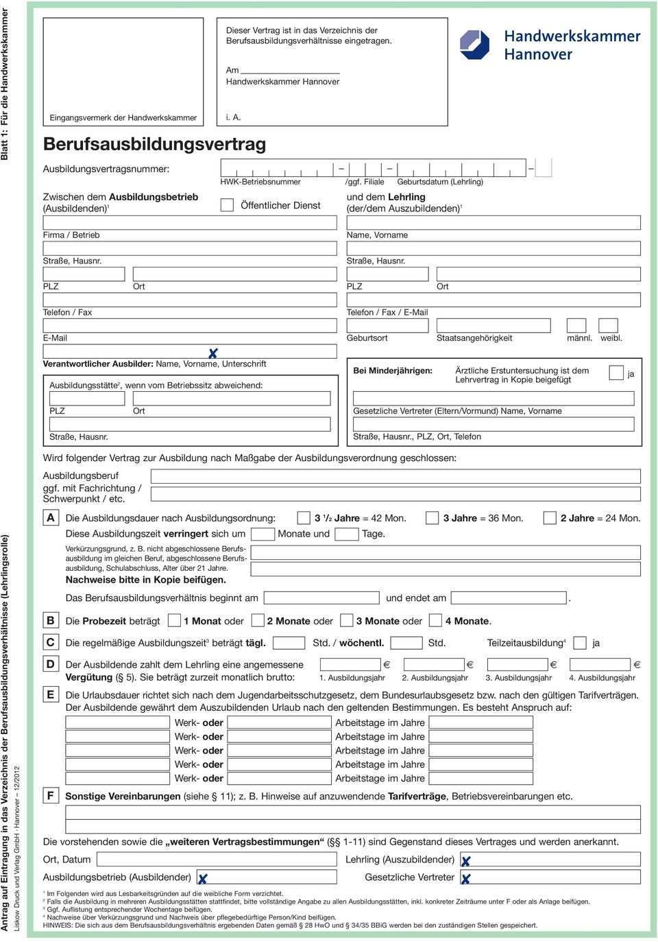 Siehe beschriftung am linken oberen seitenrand auf dem lehrvertrag senden sie uns nur das unterschriebene exemplar für die handwerkskammer seite 1 und 2. Eine haftung für den inhalt der muster kann mit ausnahme von fällen von grobem verschulden oder vorsatz nicht übernommen werden. Hier finden sie wichtige downloads und formulare aus dem bereich der berufsausbildung. Der entsprechende ausbilder muss nur noch ausgewählt werden.