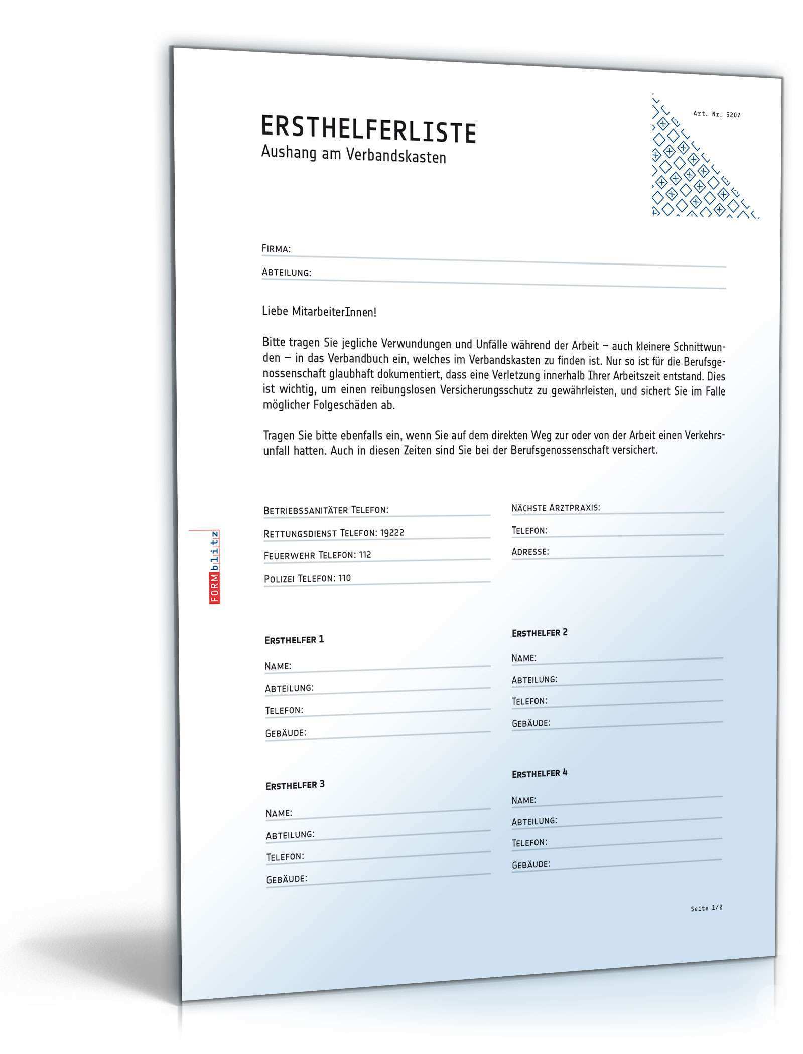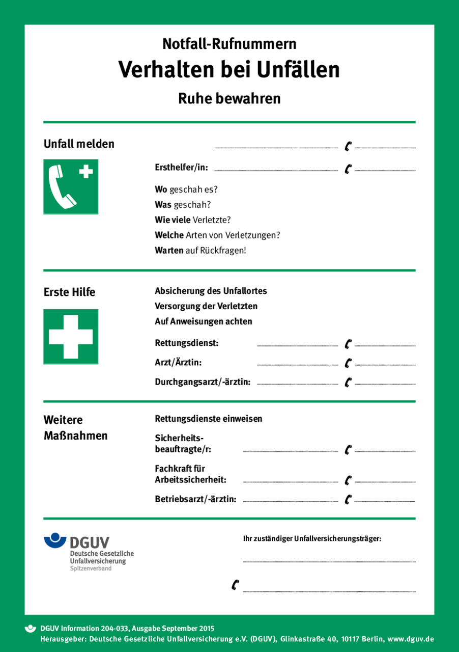 Aushang ersthelfer vorlage. Die farbgestaltung wurde modernisiert und die offiziellen rettungskennzeichen eingearbeitet. Formular für eine unfallanzeige. So wird durch den einsatz der checkliste auch auch der berufsgenossenschaftlichen vorschrift bgv a1 entsprochen. Liste mit überregionalen überbetrieblich tätigen fachkräften für arbeitssicherheit.