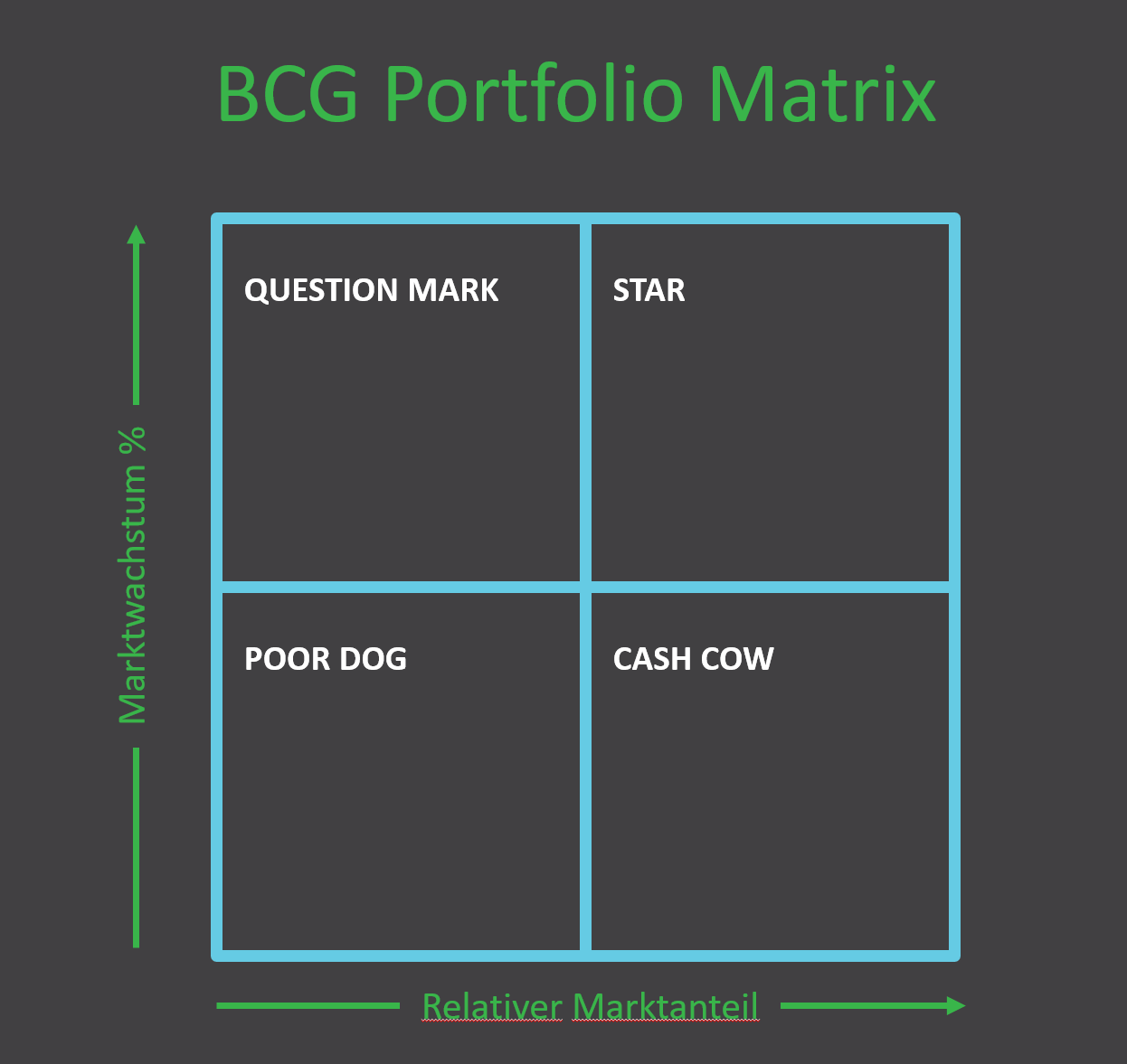 Die bcg matrix ist eine standardtechnik der wirtschaftswissenschaften und wird dir im studium begegnen. Die bcg matrix besteht aus 2 achsen. Die x achse stellt den relativen marktanteil dar dessen spanne von 0 bis 2 definiert ist. Was ist die bcg matrix.