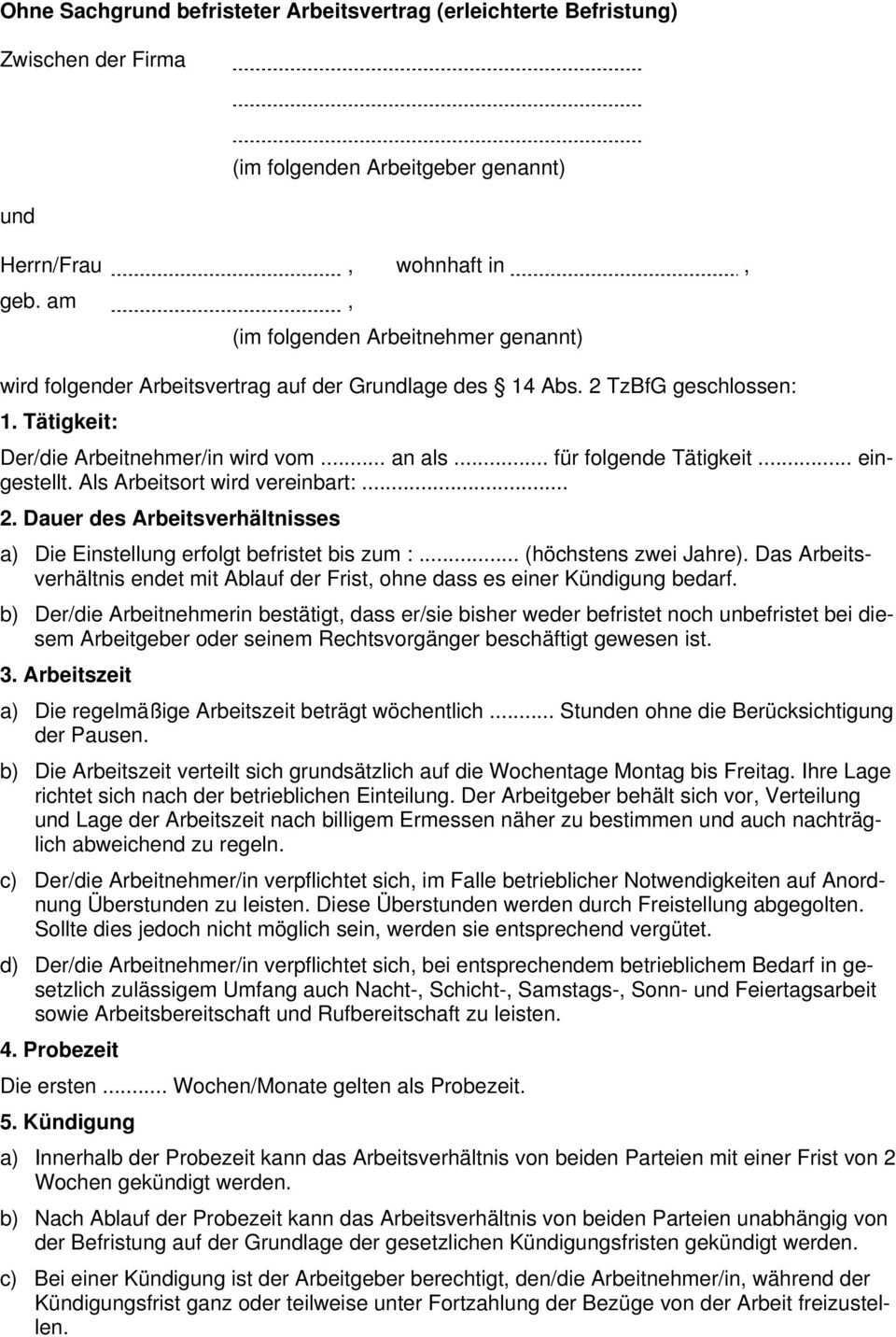 Sie können dieses muster durch eingabe ihrer persönlichen daten ergänzen. Der befristete arbeitsvertrag ohne sachgrund kann bis zu einer gesamtbeschäftigungsdauer von 2 jahren 3 mal innerhalb dieses zeitraumes verlängert werden. Befristeter arbeitsvertrag ohne tarifbindung mit sachlichem grund. Bei befristungen mit sachgrund muss der sachgrund zwar nicht im vertrag genannt werden zumindest sollte er aber in den eigenen unterlagen notiert werden da ggf.