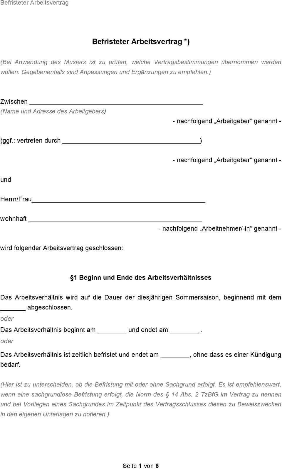 Anders bei den befristungen mit sachgrund. Dass mit dem arbeitnehmer lediglich einer der befristungsgründe aus dem katalog des 14 abs. Diese sollen immer möglich sein und können auch abgeschlossen werden wenn der mitarbeiter schon einmal bei ihnen beschäftigt war. Befristeter arbeitsvertrag bei anwendung des musters ist zu prüfen welche vertragsbestimmungen übernommen werden wollen.