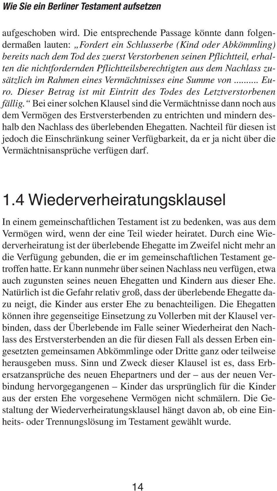 Berliner testament wiederverheiratungsklausel muster. Vor und nacherbe und pflichtteilsklausel muster. Die kinder gehen dabei zunächst leer aus. Wurde im testament die trennungslösung vereinbart kann der zuerst versterbende ehepartner verfügen dass ausschließlich die gemeinsamen kinder und nicht der partner erben sollen. 3 testamentsgestaltung x.