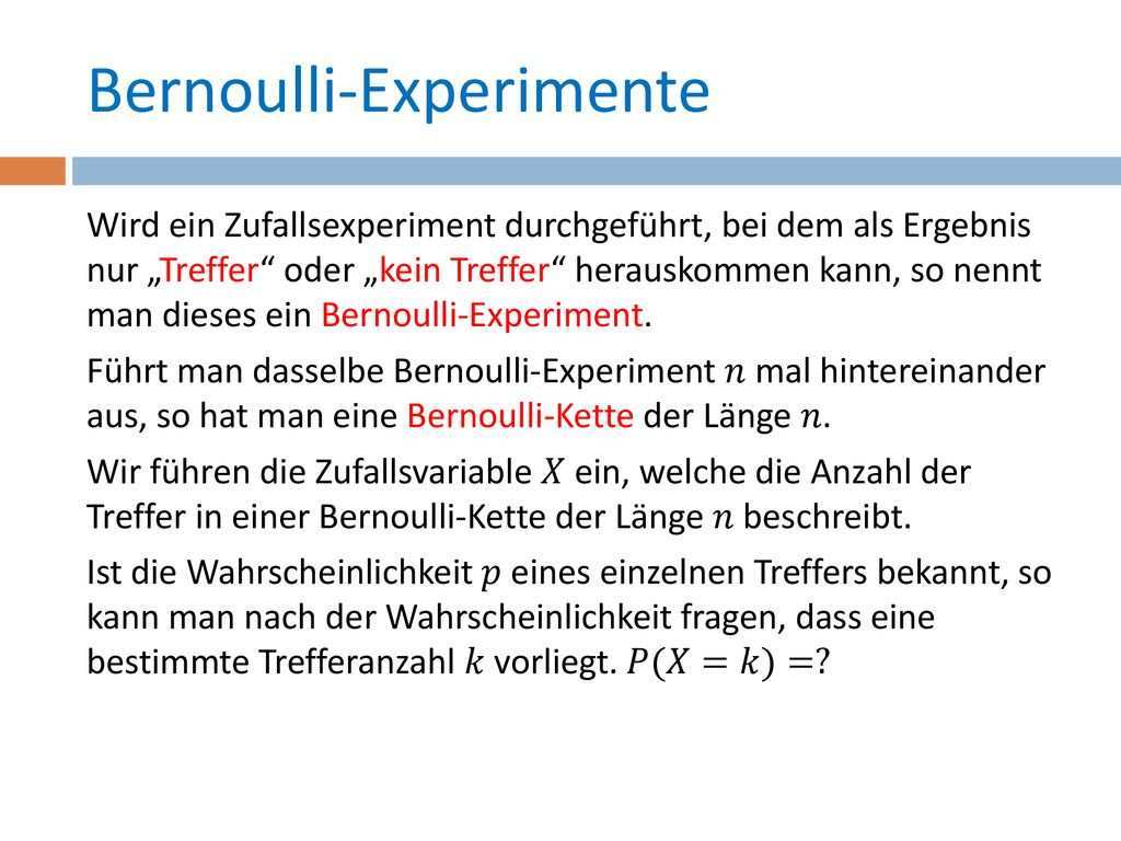 Bernoulli experiment beispiel. Das werfen eines würfels. Es gibt hierbei nur zwei mögliche ergebnisse in der ergebnismenge. P 1 6 q 5 6 re bernoulli experiment beispiele und schickt mir davon auf. P kopf 0 5.