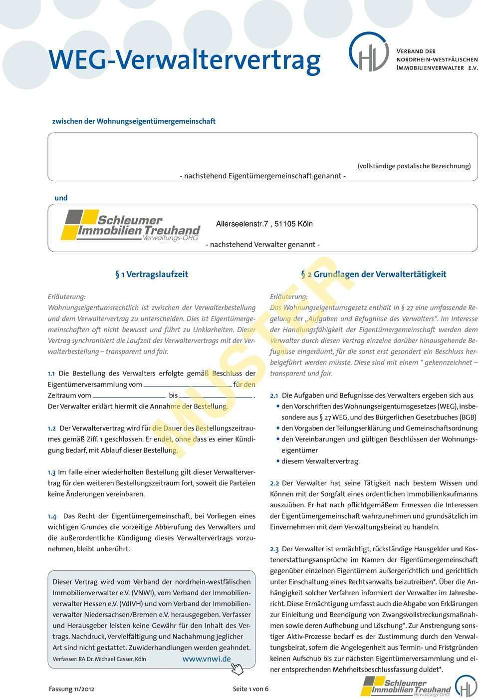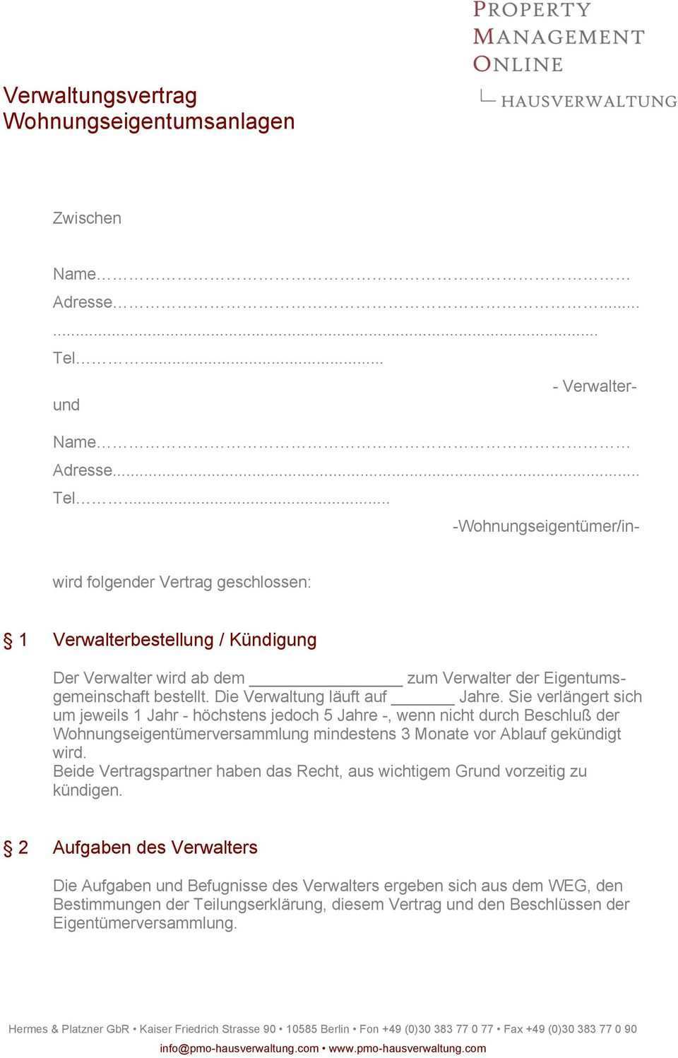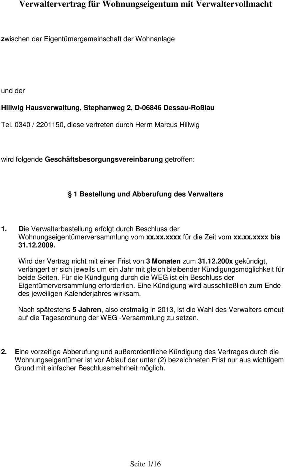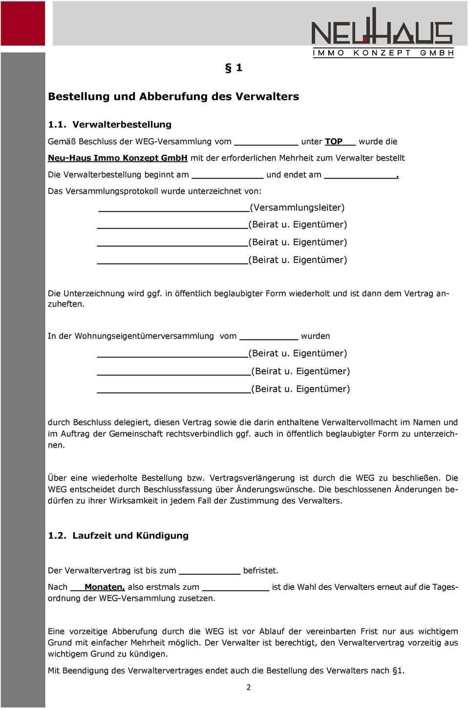 Um die einzelheiten des verwalterverhältnisses festzulegen ist es geboten zusätzlich zum beschluss einen verwaltervertrag abzuschließen. Verstöße hiergegen können zumindest zur anfechtung der verwalterbestellung führen. Firma xy hausverwaltung wird vom bis zum. Der beschluss der verwalterbestellung entspricht dann nicht der ordnungsgemäßen verwaltung.