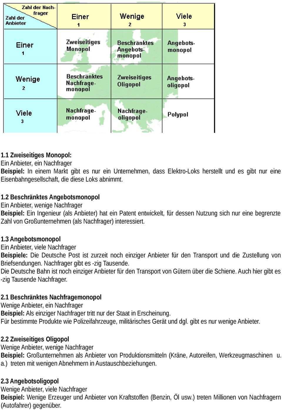 Ein freier markt für dieses produkt besteht nicht. Prinzipiell können rüstungsunternehmen auch güter an andere staaten liefern und sich somit dem nachfragemonopol entziehen. Der preis und die menge des produktes können nicht mehr über angebot und nachfrage reguliert werden. Das briefmonopol der deutschen post gilt als paradebeispiel für ein angebotsmonopol.