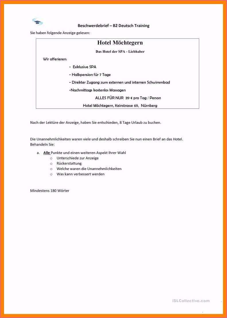 Beschwerdebrief b2 muster. Sehr geehrte damen und herren aufgrund ihrer anzeige in der zeitung habe ich vom 05 06 bis 20 06 2019 einen urlaub in ihrem camping sterntaler gebucht. Beschwerdebrief ist teil der aufgabenstellungen in b2 prüfungen telc und gehören folgende formale kriterien dazu. Es ist sehr notwendig zu wissen wie man auf deutsch reklamieren kann weil leider produkte und dienstleistungen nicht immer den erwartungen von konsumenten entsprechen. Es lohnt sich hier mit besonderer aufmerksamkeit mitzulesen denn einige punkte werden nicht für sprachkenntnisse vergeben sondern auch für rein.