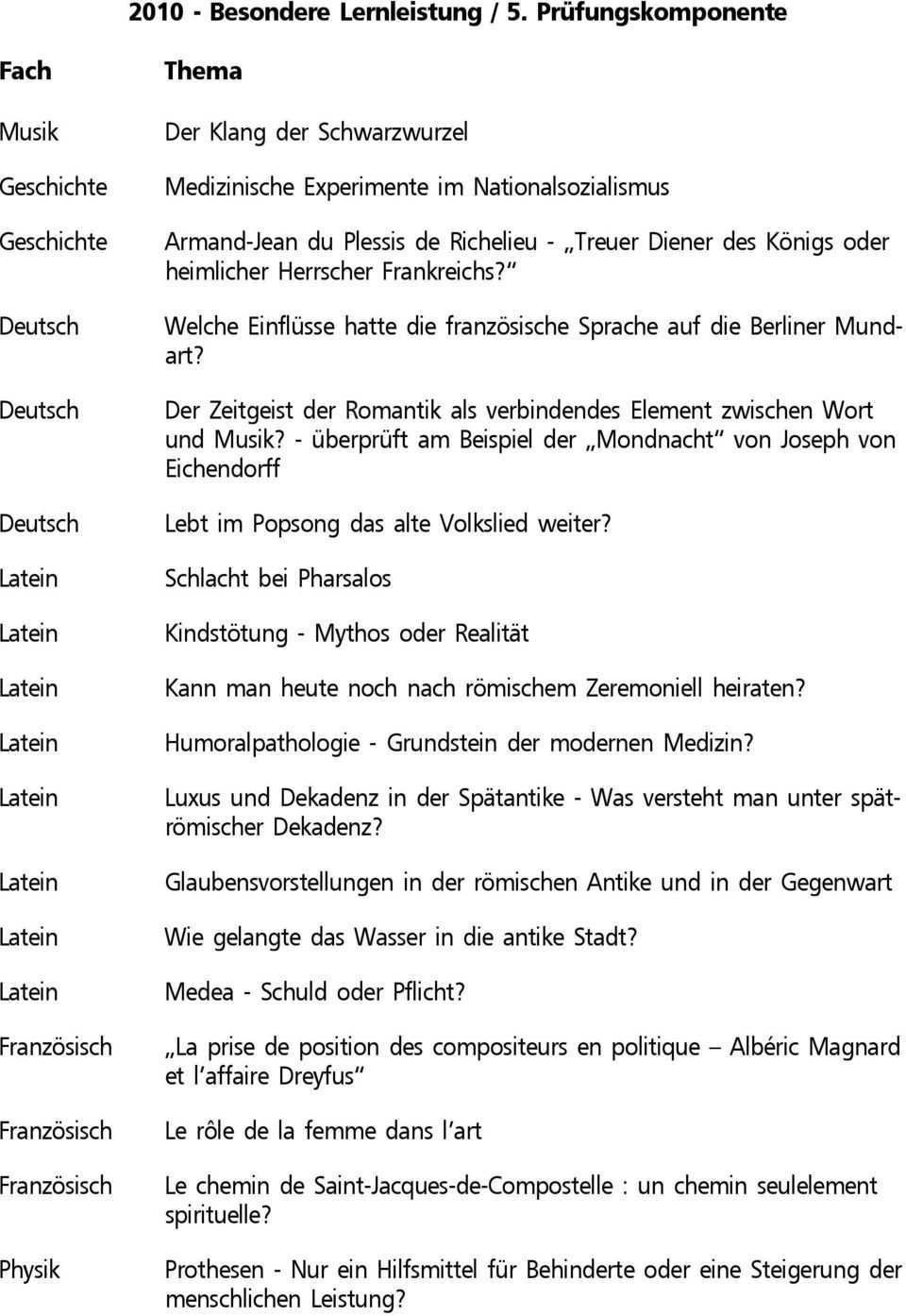 Ein umfassender beitrag aus einem vom land geförderten wettbewerb eine jahresarbeit das ergebnis eines umfassenden auch fachübergreifenden projekts oder praktikums in bereichen die schulischen referenzfächern zugeordnet werden können. Abiturfach 17 eine besondere lernleistung wird im rahmen oder umfang eines mindestens 2 halbjahre umfassenden kurses erbracht und geht in die punktzahl des abiturbereichs ein. Die besondere lernleistung unterscheidet sich von der bisherigen facharbeit und noch mehr vom praktikumsbericht deutlich im anforderungsniveau in der komplexität der aufgabenstellung und im umfang der ca. Als fünftes abiturprüfungsfach ins abitur eingebracht werden oder 2.