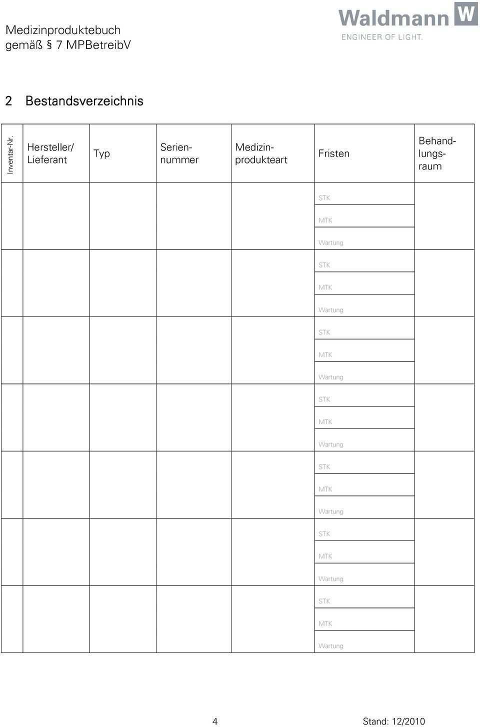 Mitarbeiterunterweisungen und betriebsanweisungen aller medizinprodukte der anlage 1 2 den medizinprodukte büchern zuordnen und diese für alle mitarbeiter zugänglich aufbewahren. Die aufnahme in ein verzeichnis das auf grund anderer vorschriften 12 medgv geführt wurde ist ebenfalls möglich. Bestandsverzeichnis medizinprodukte last modified by. Bestandsverzeichnis gemäß 8 mpbetreibv der betreiber hat für alle aktiven nichtimplantierbaren medizinprodukte ein bestandsverzeichnis zu führen.