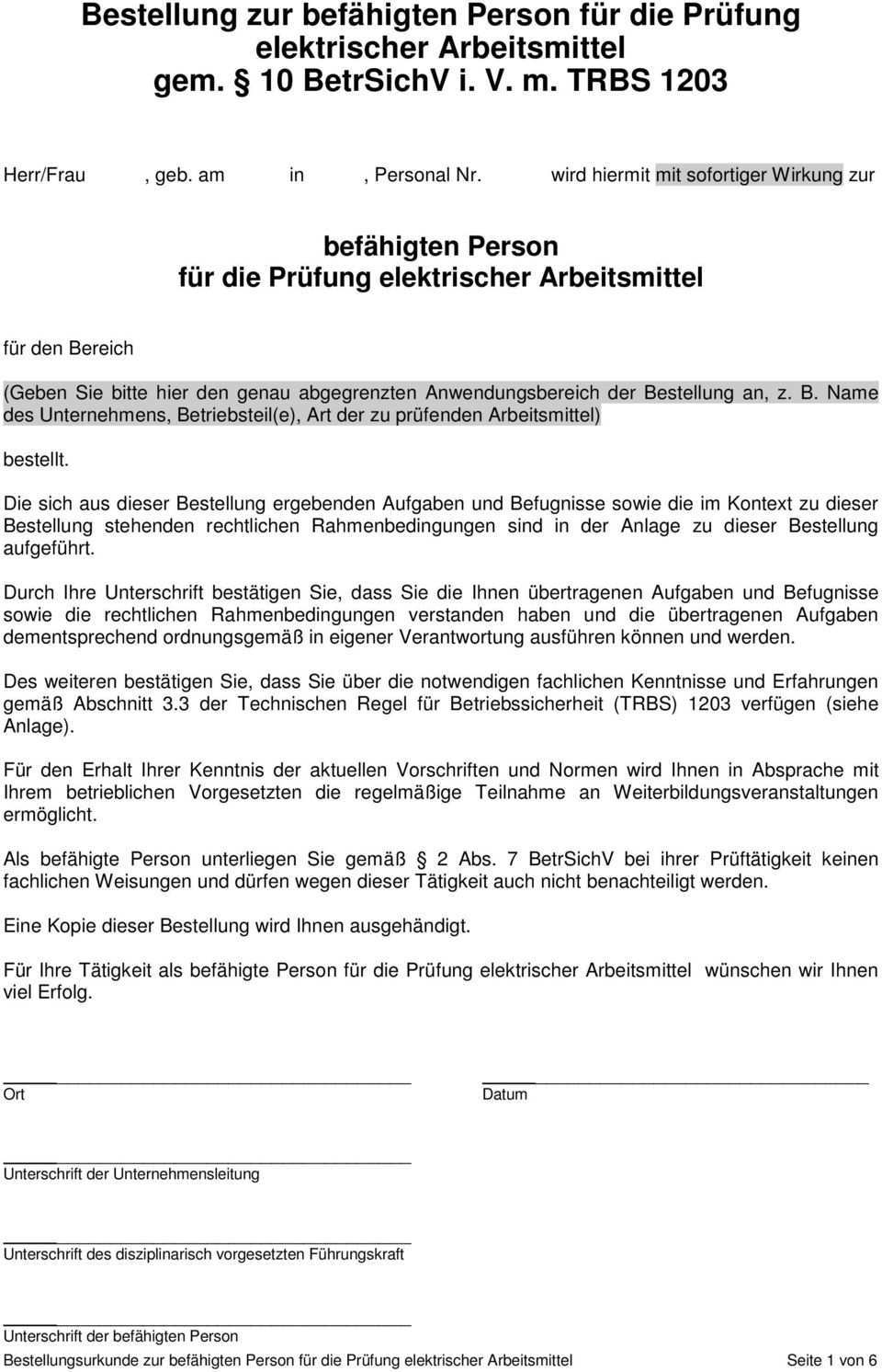Die unterlagen stellen wir ihnen als word datei zur verfügung. Hartwig müller ggf beschreibung der aufgaben der befähigten person trbs 1203 befähigte personen. Muster checkliste arbeiten im bereich von gleisen. Bestellung zur befähigten person bp teilen sie uns einfach ihre e mail adresse mit und sie erhalten innerhalb kürzester zeit eine e mail mit link zu den angeforderten unterlagen.