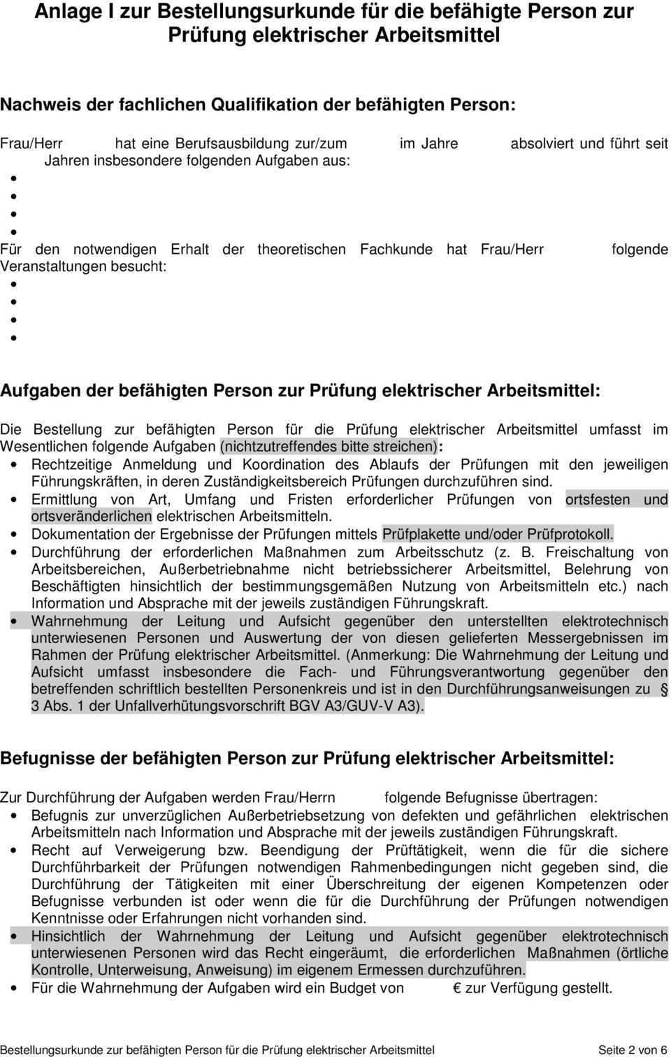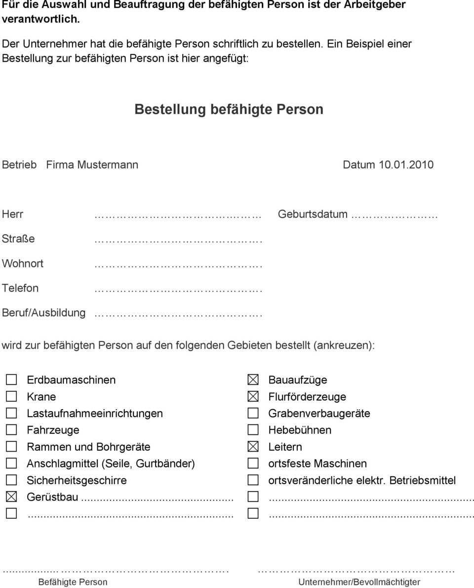 Die genannten pflichten nennen beispielhaft allgemeine und typische aufgaben der der befähigten person. 1 0 seite 8 von 9 12 07 2017 allgemeiner hinweis zu der vorlage bestellung der der befähigten person.