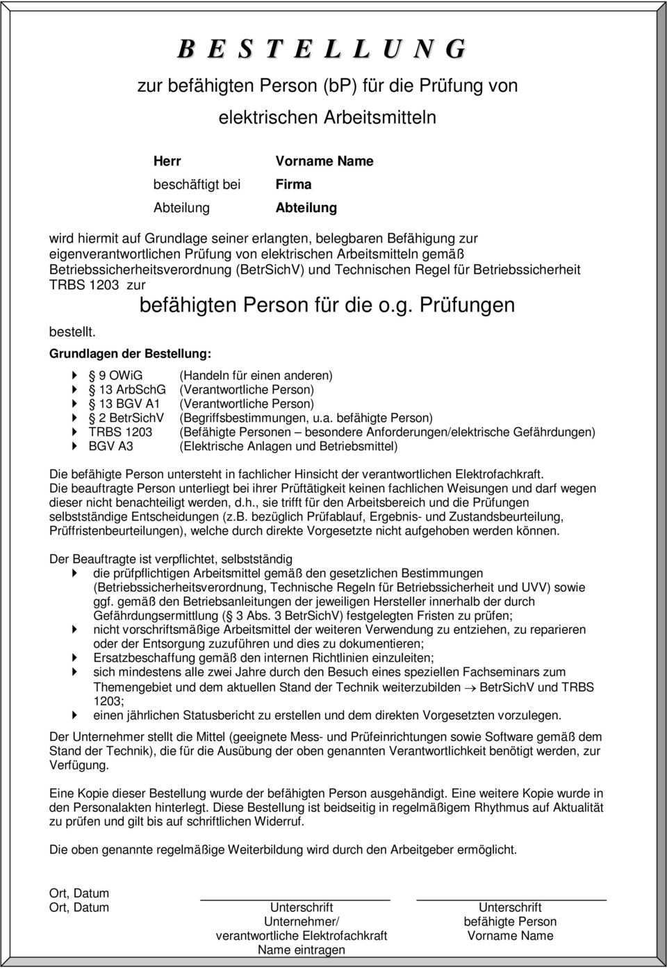 Bestellung befaehigte person muster. Bestellung zur prüfung befähigte person von arbeitsmitteln. Ort unterschriften p l le mbh geschäftsleitung datum enntnisnahme err tinzmann anlagen. Gratis muster formulare für bestellungen in der elektrotechnik. Die muster industriebau richtlinie ist eine wichtige orientierung beim baulichen brandschutz architekten sachverständige brandschutzplaner unternehmen und behördliche bauaufsichten haben bereits auf die umsetzung der vorgaben der europäischen union für den vorbeugenden brandschutz bei dem bau von neuen industriegebäuden gewartet.