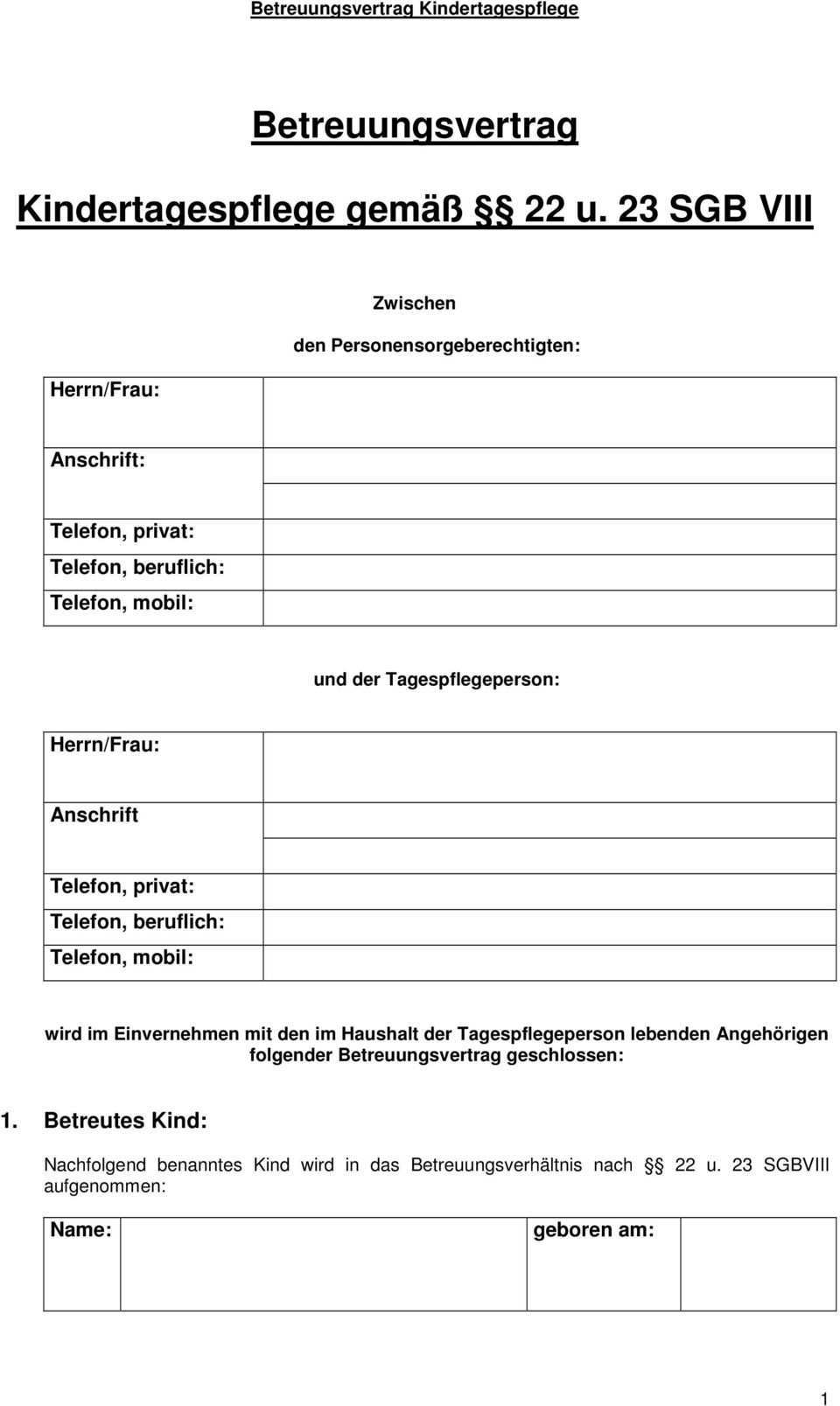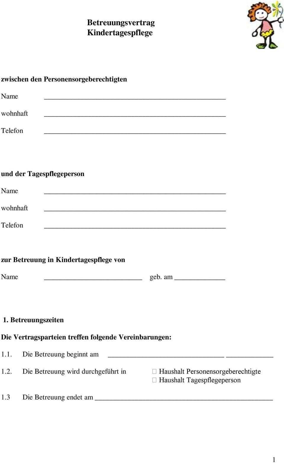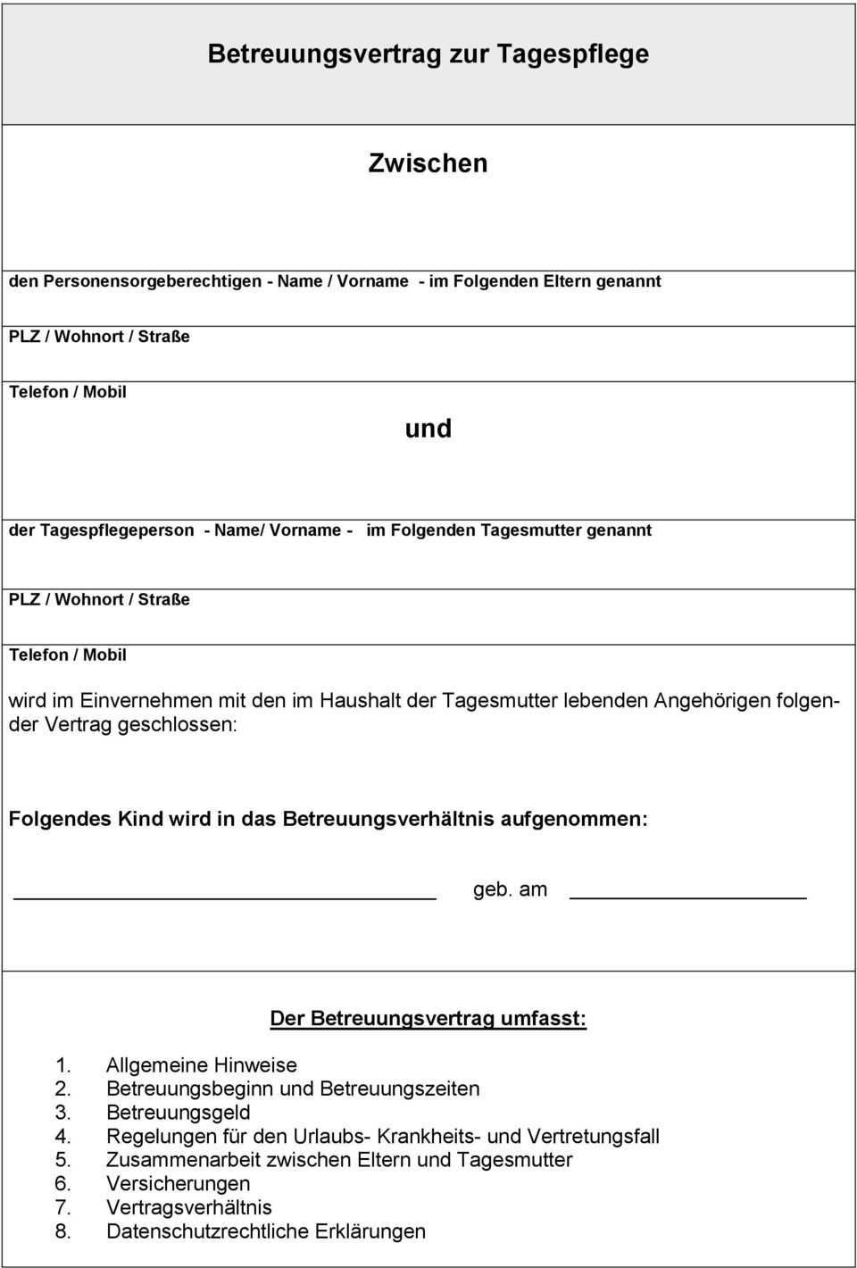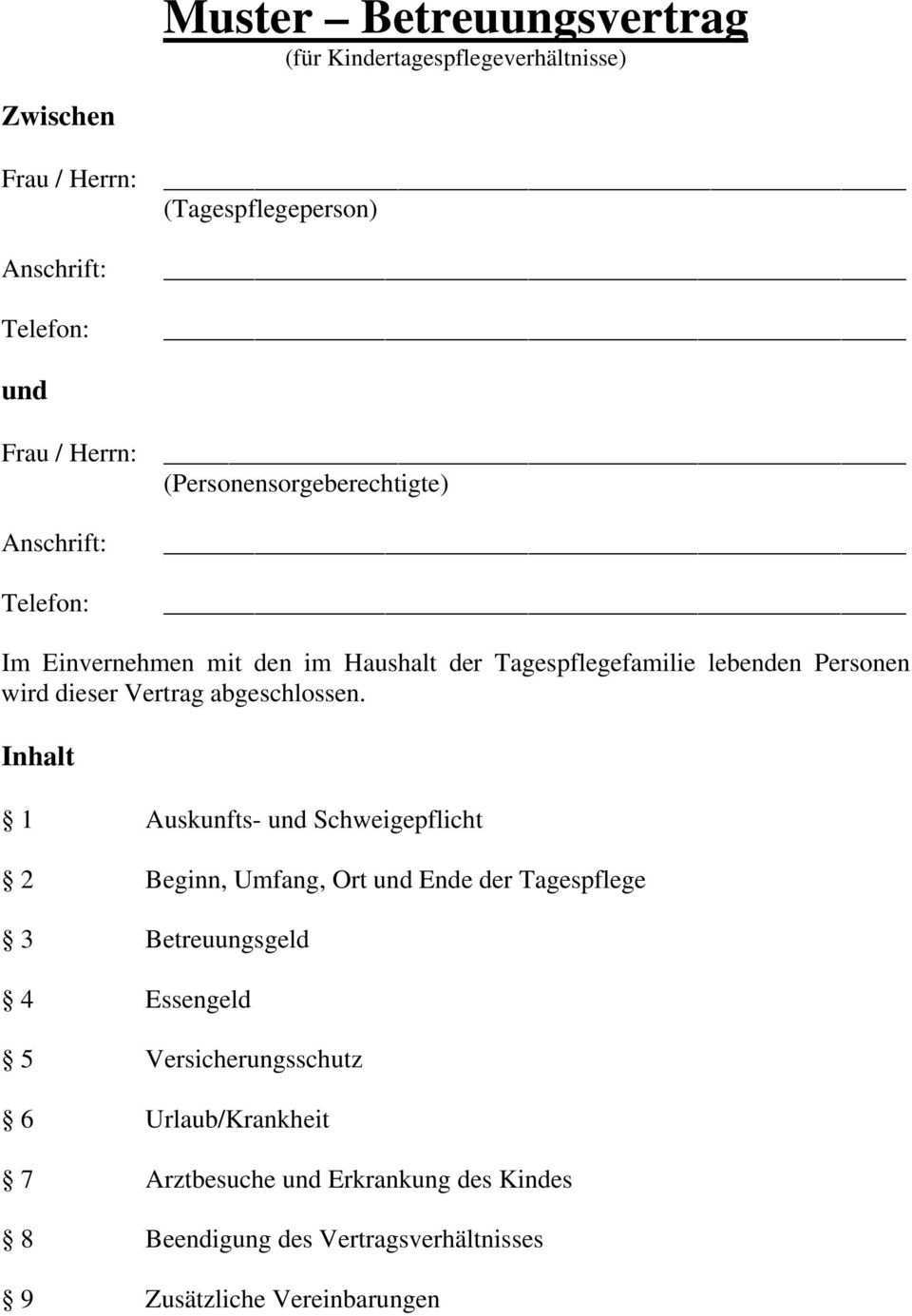 Betreuungsvertrag tagesmutter muster. Er erhebt jedoch keinen anspruch auf vollständigkeit da die jeweiligen tagespflegeverhältnisse sehr unterschiedlich gestaltet sind. Eine tagesmutter ein tagesvater oder die sogenannte kindertagespflege ist im gegensatz zur betreuung in einer kindertagesstätte privat und familienähnlich dabei werden die kinder bei einer tagesmutter oder einem tagesvater zu hause betreut meist in kleinen gruppen. Der ihnen vorliegende betreuungsvertrag umfasst alle wichtigen inhalte welche die betreuung eines kindes durch eine tagespflegeperson betreffen. Betreuungsvertrag tagesmutter vater erstellen sie ihre vorlage mit einem einfachen formular.