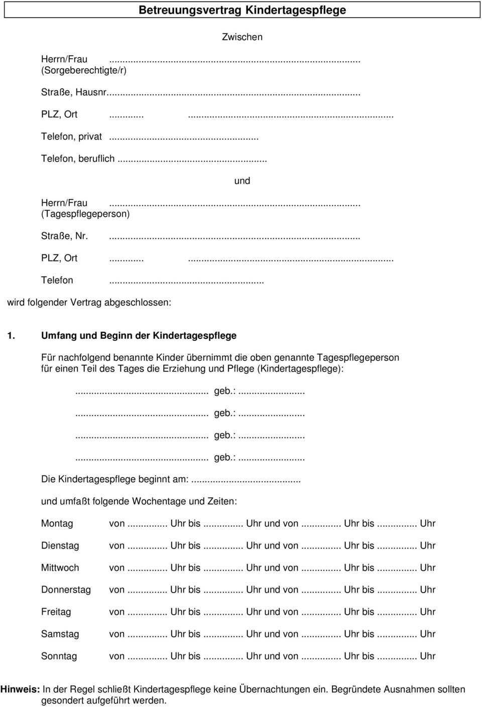 Betreuungsvertrag Tagesmutter Muster