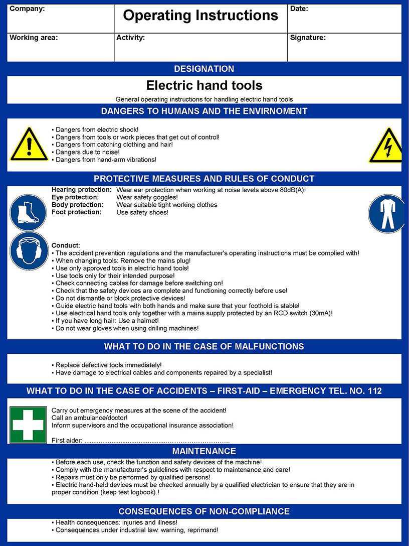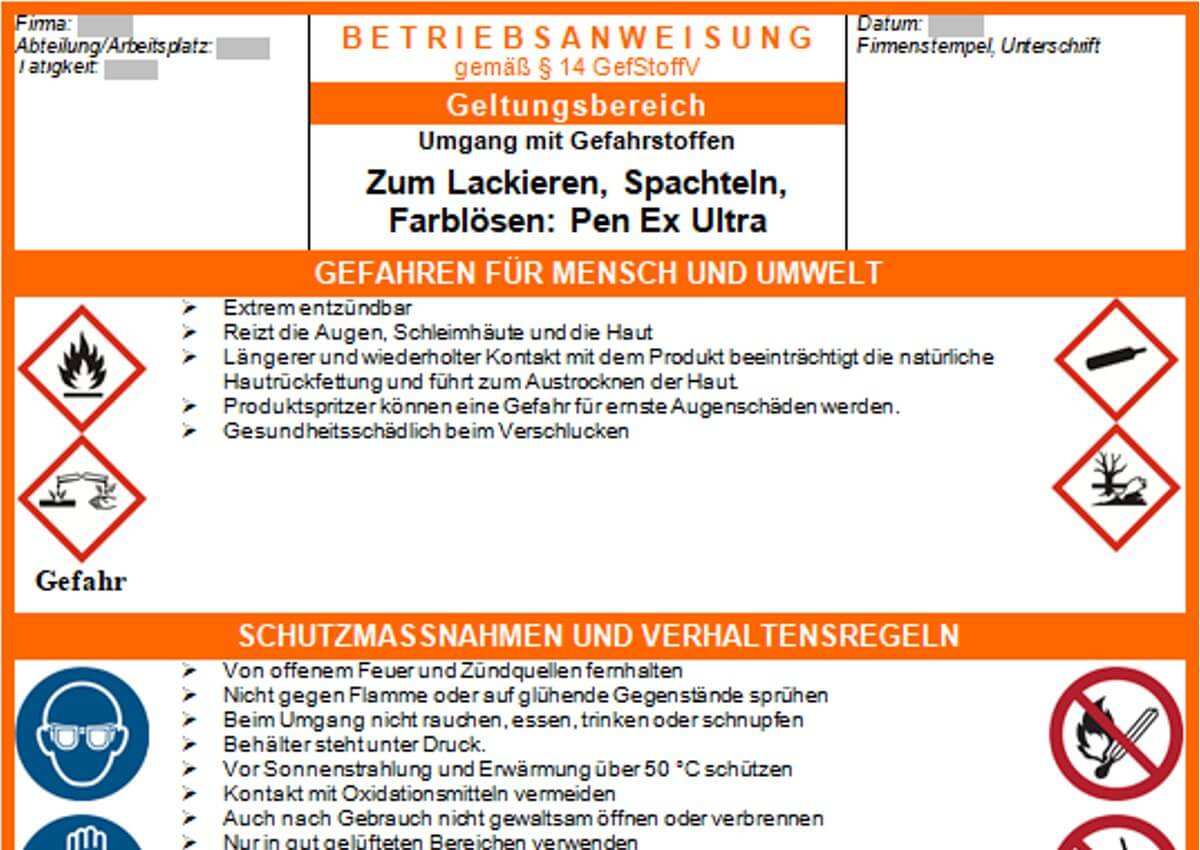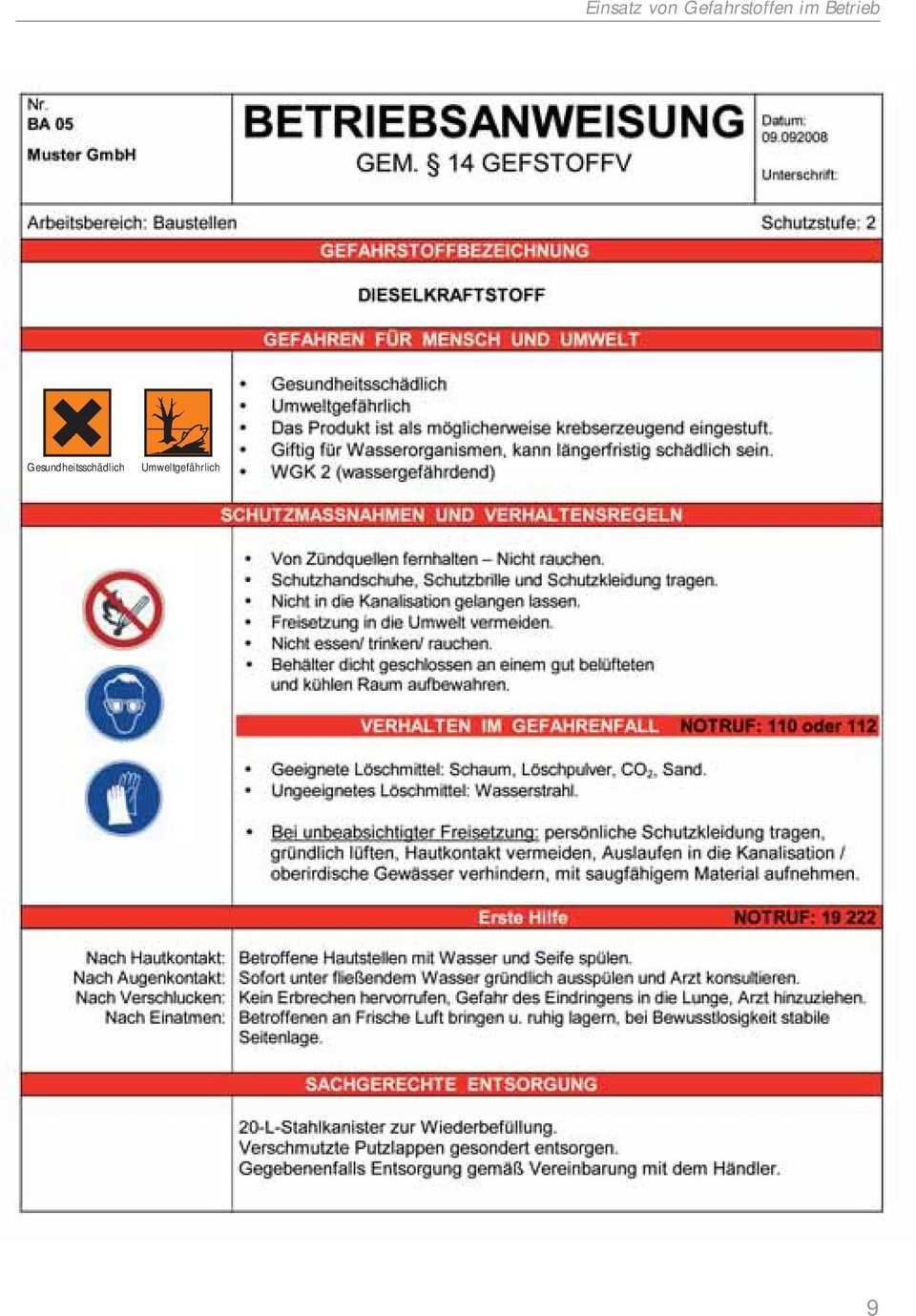 Neben dem netz können sie vorlagen auch im buchladen oder in einem bürogeschäft abholen. Bei einer betriebsanweisung für den umgang mit einem bestimmten gefahrstoff oder einer gefährlichen zubereitung macht es wenig sinn lediglich die stoffdaten zu nennen oder sich bei der bezeichnung der gefahren und schutzmaßnahmen nur auf die gefahrenhinweise r sätze und sicherheitsratschäge s sätze auf der gefahrstoffkennzeichnung zu. Betriebsanweisung ba ist nur der oberbegriff über eine ganze reihe verschiedenster arbeitsanweisungen die bei arbeiten mit gefährlichen stoffen das können sowohl chemikalien als auch gentechnisch veränderte organismen sein komplizierten und oder gefährlichen maschinen sowie bei unfallgefährdeten tätigkeiten einen erprobten und sicheren arbeitsablauf gewährleisten sollen. Sicherheitsdatenblatt und betriebsanweisung als wichtige informationsquelle.