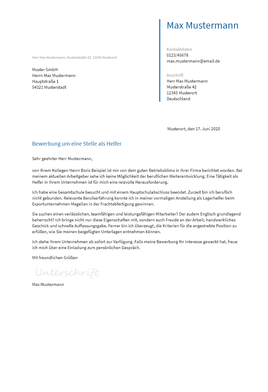 Muster bewerbung als lagerhelfer. Dieses muster bewerbungsschreiben als lagermitarbeiterin ist wie alle anderen muster bewerbungsvorlagen nur als beispiel gedacht. Es stehen bewerbungsschreiben für berufstätige und für auszubildende zum download bereit. Ihr stellenangebot vom in sehr geehrte r frau herr sie suchen eine verstärkung für ihr team in und bieten einen abwechslungsreichen arbeitsplatz in einem modernen unternehmen.