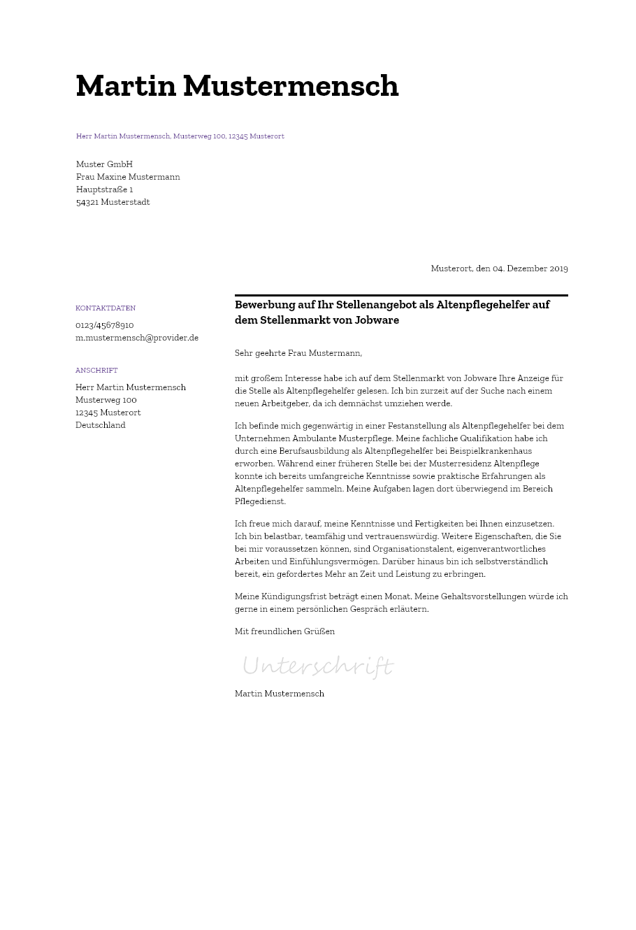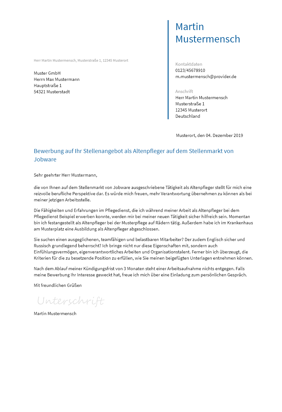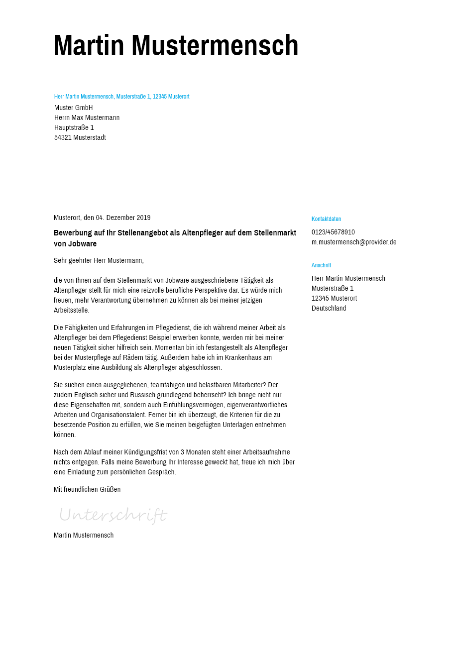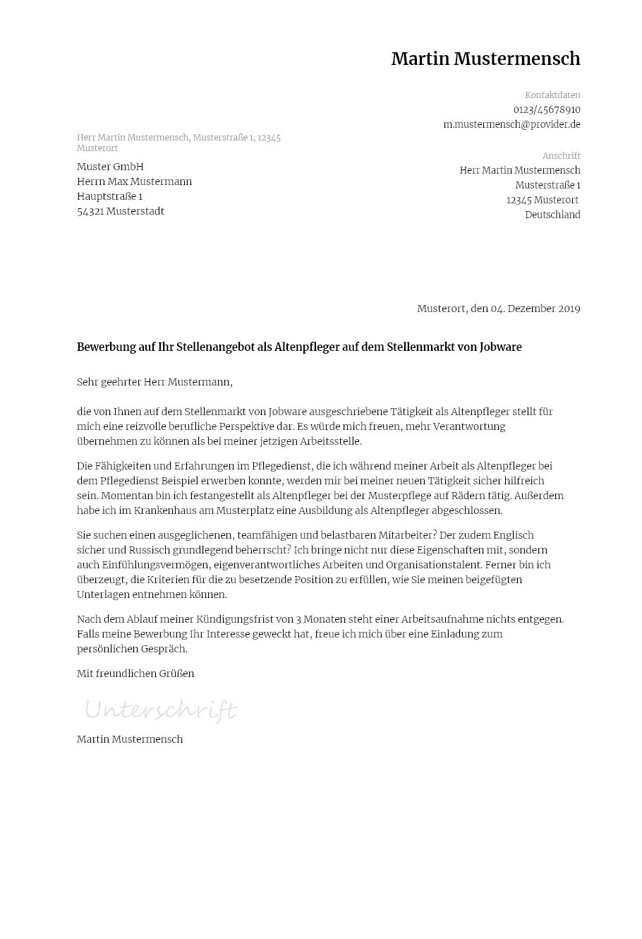 Mein interesse zu diesem interessanten berufsbild lässt sich auf die pflege meiner großmutter zurückführen. Hiermit möchte ich mich um einen ausbildungsplatz bewerben. Ich freue mich wenn sie mir gelegenheit geben die weichen für meine berufliche zukunft mit und bei ihnen zu stellen. Im folgenden siehst du ein muster für ein bewerbungsschreiben als altenpfleger in.