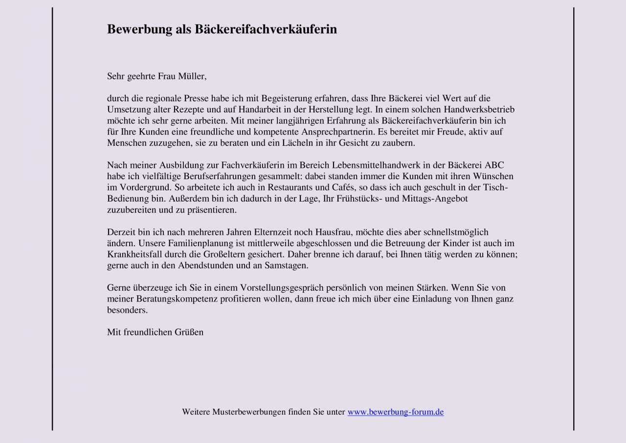 Hier findest du die komplette bewerbung. Sehr geehrte r frau herr name sie gehören zu den wenigen bäckereien und konditoreien die als handwerksbetriebe auf eine lange tradition zurückblicken fest mit dem ortsbild verwurzelt sind und sich erfolgreich gegen die große konkurrenz durch supermärkte und discounter. Aushilfe beim bäcker bewerbung als bäckereiverkäuferin wenn ihr berufsanfänger oder berufspraktiker seid dann könnt ihr eure bewerbungsbeispiele in dieser rubrik zur diskussion stellen und die musterbewerbungen anderer bewerber bewerten. Sie müssen keinen blitzsauberen lebenslauf vorlegen keine super noten in der schule gesammelt oder zahlreiche praktika absolviert haben.