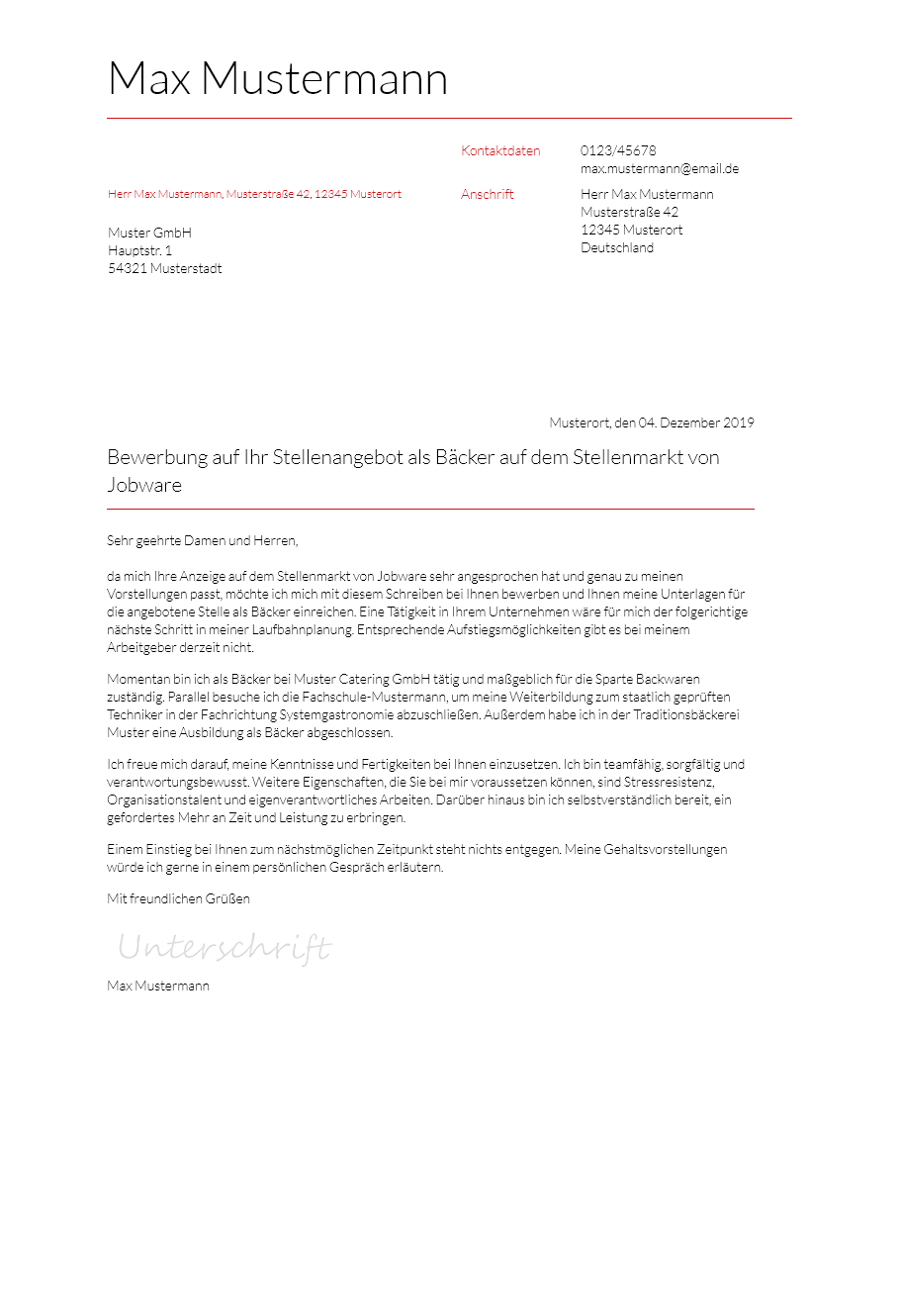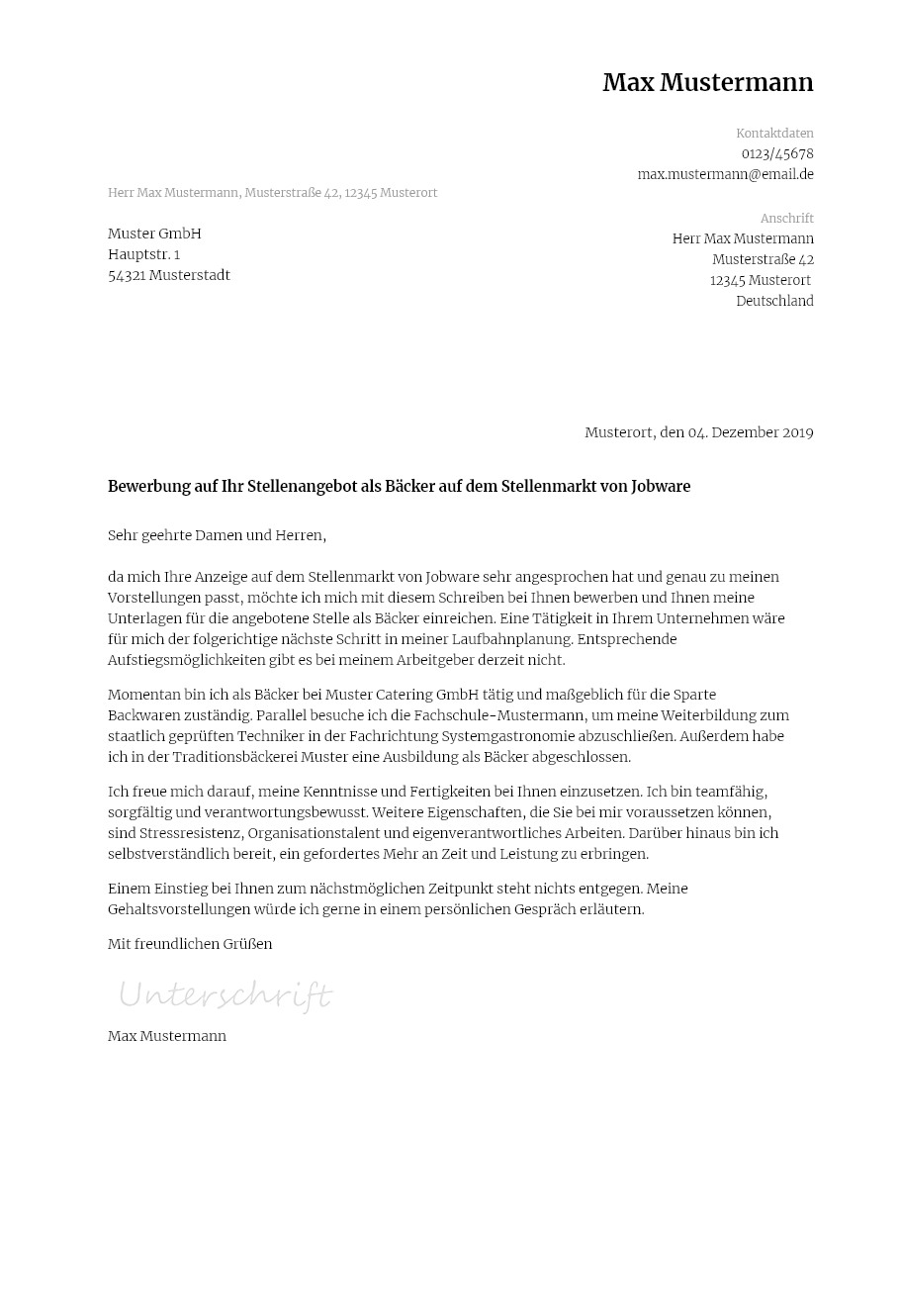 Die muster dokumente wurden speziell für diesen beruf erstellt. Sie bekommen den job vorausgesetzt sie zeigen dass sie motiviert und zuverlässig sind. Es stehen bewerbungsschreiben für berufstätige und für auszubildende zum download bereit. Bewerbung um einen nebenjob bei name der bäckerei sehr geehrter herr mustermann mit großer freude habe ich ihre stellenanzeige vom datum auf www backinjob de gelesen und möchte ihnen meine unterstützung als kontaktfreudige ehrliche und freundliche aushilfe anbieten.